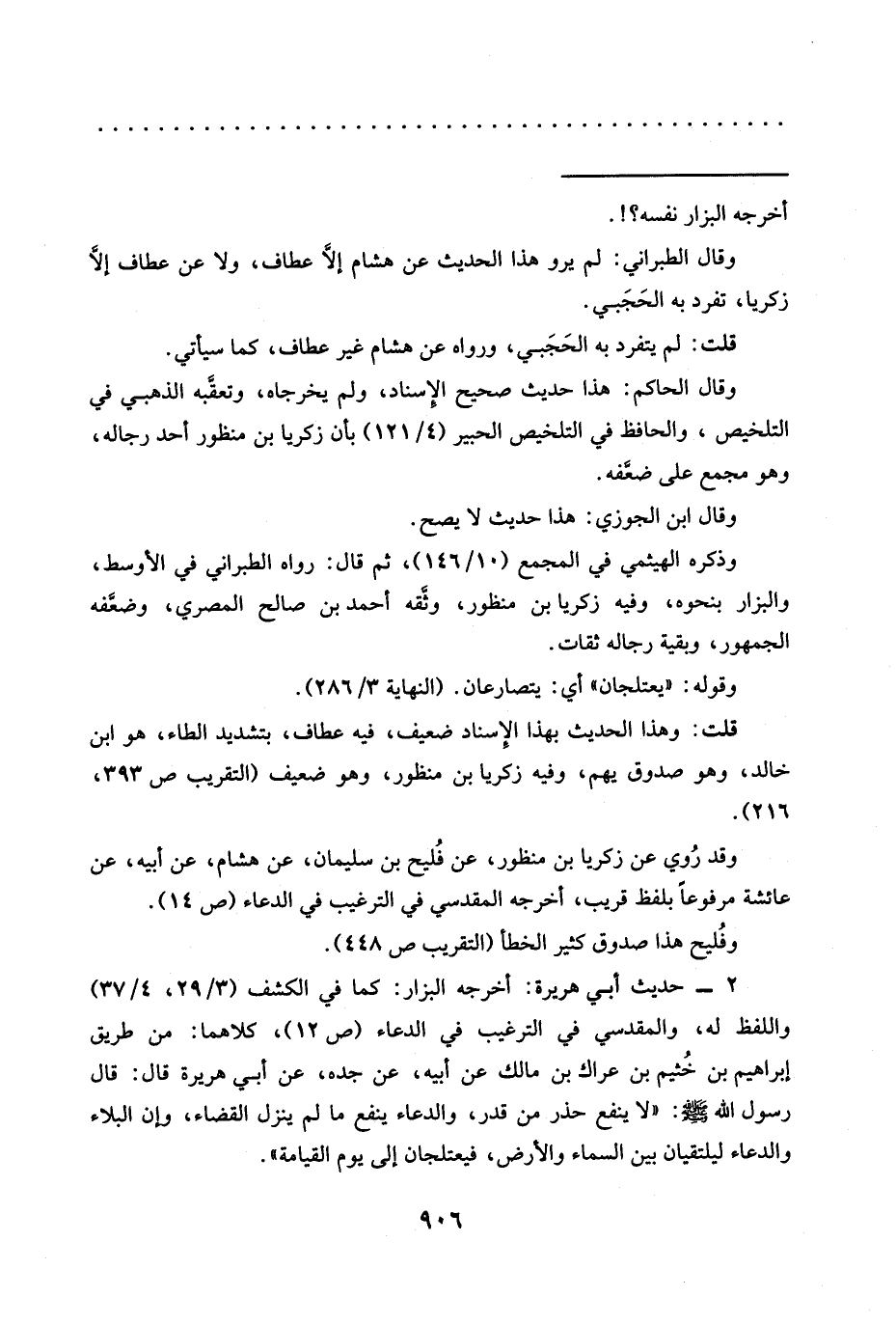 وقال الطبراني: لم يرو هذا الحديث عن هشام إلَّا عطاف، ولا عن عطاف إلَّا زكريا، تفرد به الحَجَبي.