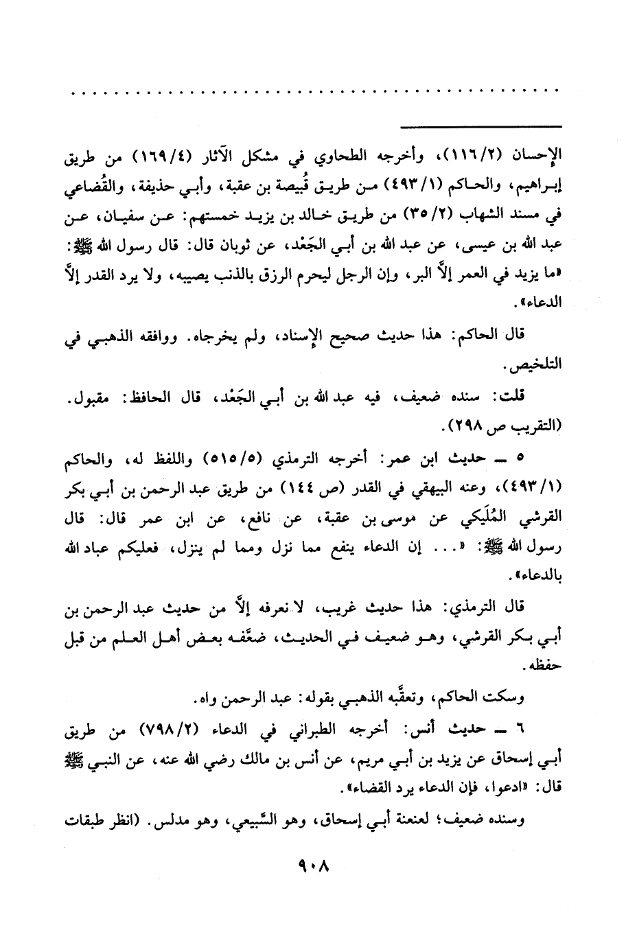 5 - حديث ابن عمر: أخرجه الترمذي (5/ 515) واللفظ له، والحاكم (1/ 493)، وعنه البيهقي في القدر (ص 144) من طريق عبد الرحمن بن أبي بكر القرشي المُلَيكي عن موسى بن عقبة، عَنْ نَافِعٍ، عَنِ ابْنِ عُمَرَ قَالَ: قَالَ رسول الله -صلى الله عليه وسلم-: " ... أن الدعاء ينفع مما نزل ومما لم ينزل، فعليكم عباد الله بالدعاء".