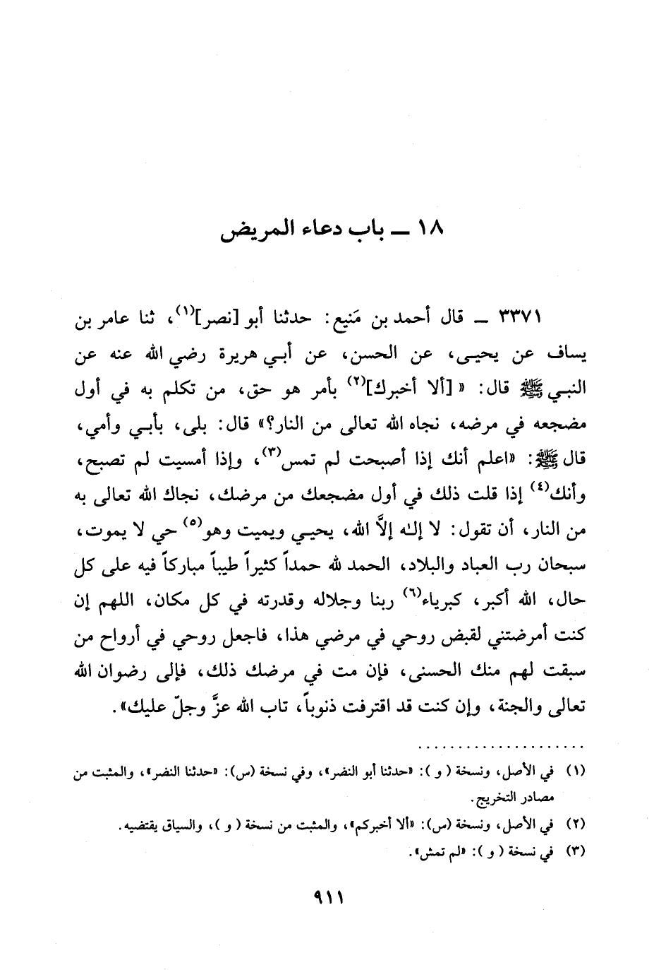 3371 - قال أَحْمَدُ بْنُ مَنِيعٍ: حدثنا أبو [نصر] ، ثنا عَامِرُ بْنُ يِسَافٍ عَنْ يَحْيَى، عَنِ الْحَسَنِ، عَنْ أَبِي هُرَيْرَةَ رَضِيَ الله عَنْه عَنِ النَّبِيِّ صَلَّى اللَّهُ عَلَيْهِ وَسَلَّمَ قَالَ: " [أَلَا أُخْبِرُكَ] بِأَمْرٍ هُوَ حَقٌّ، مَنْ تَكَلَّمَ بِهِ فِي أَوَّلِ مَضْجَعِهِ فِي مَرَضِهِ، نجاه الله تعالى مِنَ النَّارِ؟ " قَالَ: بَلَى، بِأَبِي وَأُمِّي، قَالَ صَلَّى اللَّهُ عَلَيْهِ وَسَلَّمَ: " اعْلَمْ أَنَّكَ إِذَا أَصْبَحْتَ لَمْ تُمْسِ، وَإِذَا أَمْسَيْتَ لَمْ تُصْبِحْ، وَإِنَّكَ §إِذَا قُلْتَ ذَلِكَ فِي أَوَّلِ مَضْجَعِكَ مِنْ مَرَضِكَ، نجاك الله تعالى به مِنَ النَّارِ، أَنْ تَقُولَ: لَا إِلَهَ إِلَّا اللَّهُ، يُحْيِي وَيُمِيتُ وَهُوَ حَيٌّ لَا يَمُوتُ، سُبْحَانَ رَبِّ الْعِبَادِ وَالْبِلَادِ، الْحَمْدُ لِلَّهِ حَمْدًا كَثِيرًا طَيِّبًا مُبَارَكًا فِيهِ عَلَى كُلِّ حَالٍ، اللَّهُ أَكْبَرُ، كِبْرِيَاءُ رَبِّنَا وَجَلَالُهُ وَقُدْرَتُهُ فِي كُلِّ مَكَانٍ، اللَّهُمَّ إِنْ كُنْتَ أَمْرَضْتَنِي لِقَبْضِ رُوحِي فِي مَرَضِي هَذَا، فَاجْعَلْ رُوحِي فِي أَرْوَاحِ مَنْ سَبَقَتْ لَهُمْ مِنْكَ الْحُسْنَى، فَإِنْ مُتَّ فِي مَرَضِكَ ذَلِكَ، فَإِلَى رضوان الله تعالى وَالْجَنَّةِ، وَإِنْ كُنْتَ قَدِ اقْتَرَفْتَ ذُنُوبًا، تاب الله عزَّ وجلّ عَلَيْكَ ".