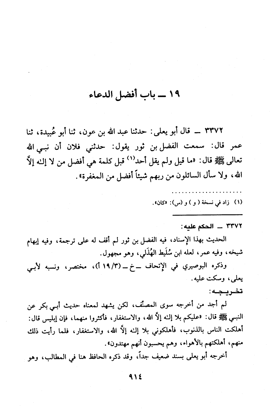 3372 - قال أَبُو يَعْلَى: حدثنا عَبْدُ اللَّهِ بْنُ عَوْنٍ، ثنا أَبُو عُبَيْدَةَ، ثنا عُمَرُ قَالَ: سَمِعْتُ الْفَضْلَ بْنَ ثَوْرٍ يَقُولُ: حدثني فلان أن نبي الله تعالى صَلَّى اللَّهُ عَلَيْهِ وَسَلَّمَ قَالَ: " §مَا قِيلَ وَلَمْ يَقُلْ أَحَدٌ قَبْلُ كَلِمَةً هِيَ أَفْضَلُ مَنْ لَا إِلَهَ إِلَّا اللَّهُ وَلَا سَأَلَ السَّائِلُونَ مِنْ رَبِّهِمْ شَيْئًا أَفْضَلَ مِنَ الْمَغْفِرَةِ ".