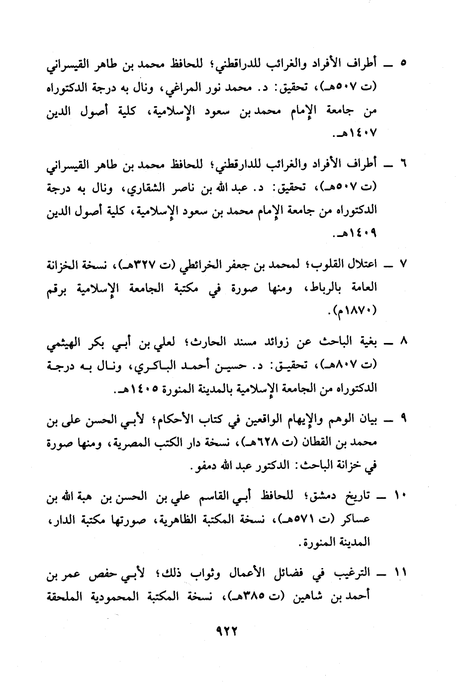 5 - أطراف الأفراد والغرائب للدراقطني؛ للحافظ محمَّد بن طاهر القيسراني (ت 507 هـ)، تحقيق: د. محمَّد نور المراغي، ونال به درجة الدكتوراه من جامعة الإمام محمد بن سعود الإِسلامية، كلية أصول الدين 1407 هـ.