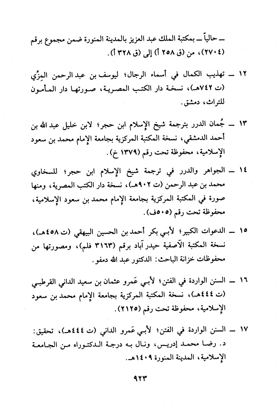 17 - السنن الواردة في الفتن؛ لأبي عَمرو الداني (ت 444 هـ)، تحقيق: د. رضا محمَّد إدريس، ونال به درجة الدكتوراه من الجامعة الإِسلامية، المدينة المنورة 1409 هـ.