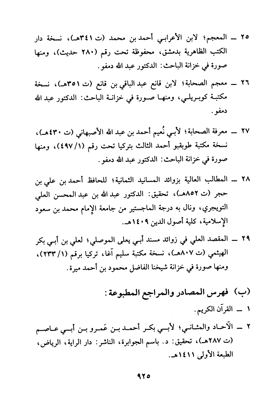 28 - المطالب العالية بزوائد المسانيد الثمانية؛ للحافظ أحمد بن علي بن حجر (ت 852 هـ)، تحقيق: الدكتور عبد الله بن عبد المحسن العلي التويجري، ونال به درجة الماجستير من جامعة الإِمام محمَّد بن سعود الإِسلامية، كلية أصول الدين 1409 هـ.