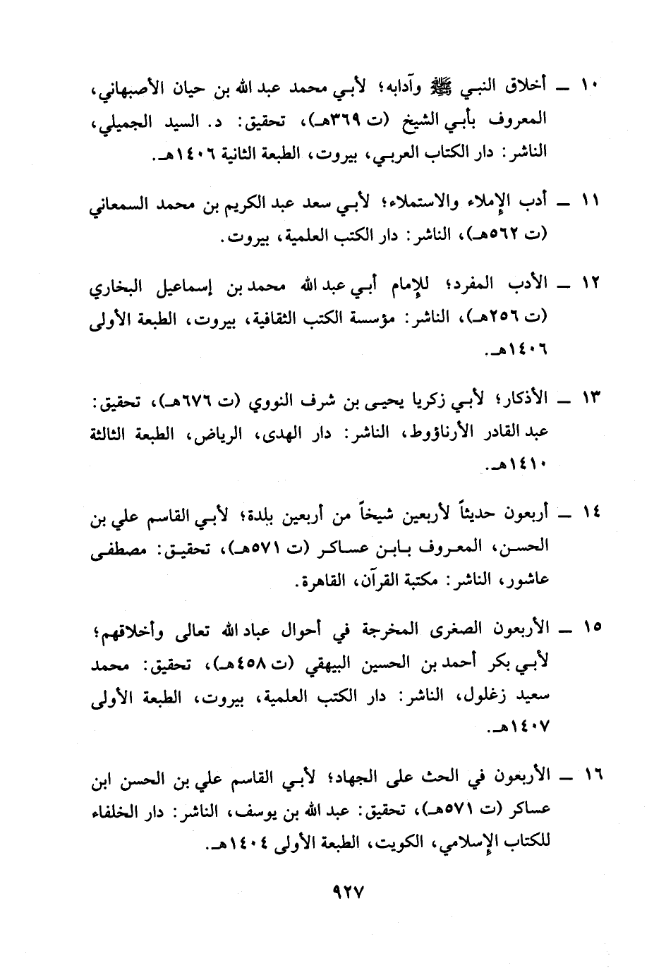 10 - أخلاق النبي -صلى الله عليه وسلم- وآدابه؛ لأبي محمَّد عبد الله بن حيان الأصبهاني، المعروف بأبي الشيخ (ت 369 هـ)، تحقيق: د. السيد الجميلي، الناشر: دار الكتاب العربي، بيروت، الطبعة الثانية 1406 هـ.