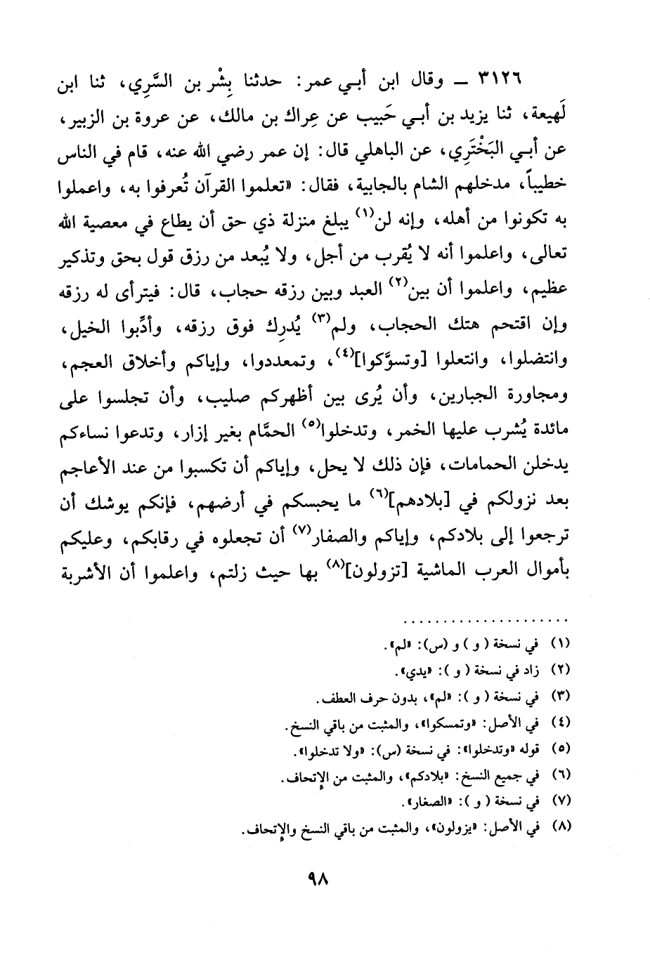 3126 - وقال ابْنُ أَبِي عُمَرَ: حدثنا بِشْرُ بْنُ السَّرِيِّ، ثنا ابن لَهِيعَةُ، ثنا يَزِيدُ بْنُ أَبِي حَبِيبٍ عَنْ عِرَاكِ بْنِ مَالِكٍ، عَنْ عُرْوَةَ بْنِ الزُّبَيْرِ، عَنْ أَبِي الْبَخْتَرِيِّ، عن الباهلي قال: أَنَّ عُمَرَ رَضِيَ الله عَنْه، قَامَ فِي النَّاسِ خَطِيبًا، مَدْخَلَهُمُ الشَّامَ بِالْجَابِيَةِ، فَقَالَ: " §تَعَلَّمُوا الْقُرْآنَ تُعْرَفُوا بِهِ، وَاعْمَلُوا بِهِ تَكُونُوا مِنْ أهله، وإنه لن يَبْلُغْ مَنْزِلَةَ ذِي حَقٍّ أَنْ يُطَاعَ فِي معصية الله تعالى، وَاعْلَمُوا أَنَّهُ لَا يُقَرِّبُ مِنْ أَجَلٍ، وَلَا يُبَعِّدُ مِنْ رِزْقٍ قَوْلٌ بِحَقٍّ وَتَذْكِيرُ عَظِيمٍ، وَاعْلَمُوا أَنَّ بَيْنَ الْعَبْدِ وبين رزقه حجاب، قال: فيترأى له رِزْقِهِ وَإِنِ اقْتَحَمَ هَتَكَ الْحِجَابَ، وَلَمْ يُدْرِكْ فَوْقَ رِزْقِهِ، وَأَدِّبُوا الْخَيْلَ، وَانْتَضِلُوا، وَانْتَعِلُوا [وَتَسَوَّكُوا] ، وَتَمَعْدَدُوا، وَإِيَّاكُمْ وَأَخْلَاقَ الْعَجَمِ، وَمُجَاوِرَةَ الْجَبَّارِينَ، وَأَنْ يُرَى بَيْنَ أَظْهُرِكُمْ صَلِيبٌ، وَأَنْ تَجْلِسُوا عَلَى مَائِدَةٍ يُشْرَبُ عَلَيْهَا الْخَمْرُ، وتدخلوا الْحَمَّامَ بِغَيْرِ إِزَارٍ، وتدعوا نِسَاءَكُمْ يَدْخُلْنَ الْحَمَّامَاتِ، فَإِنَّ ذَلِكَ لَا يَحِلُّ، وَإِيَّاكُمْ أَنْ تَكْسِبُوا مِنْ عِنْدِ الْأَعَاجِمِ بَعْدَ نُزُولِكُمْ فِي [بِلَادِهِمْ] مَا يَحْبِسُكُمْ فِي أرضهم، فإنكم يوشك أَنْ تَرْجِعُوا إِلَى بِلَادِكُمْ، وَإِيَّاكُمْ والصفار أَنْ تَجْعَلُوهُ فِي رِقَابِكُمْ، وَعَلَيْكُمْ بِأَمْوَالِ الْعَرَبِ الْمَاشِيَةِ [تزولون] بها حيث زلتم، وَاعْلَمُوا أَنَّ الْأَشْرِبَةَ