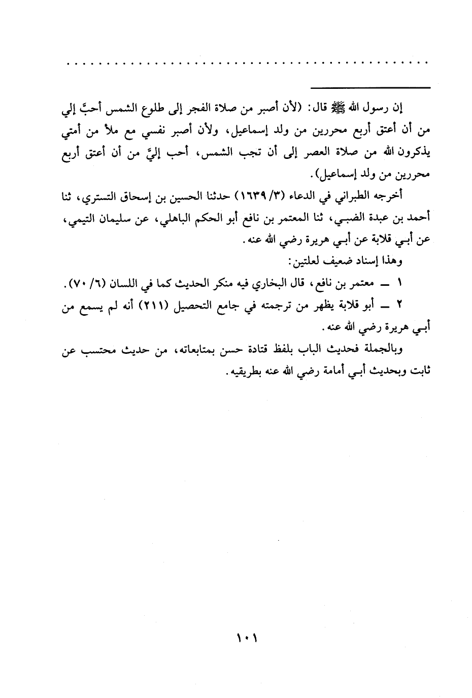 = أن رسول الله -صلى الله عليه وسلم- قال: (لأن أصبر من صلاة الفجر إلى طلوع الشمس أحبَّ إلى من أن أعتق أربع محررين من ولد إسماعيل، ولأن أصبر نفسي مع ملأ من أمتي يذكرون الله من صلاة العصر إلى أن تجب الشمس، أحب إليَّ من أن أعتق أربع محررين من ولد إسماعيل).