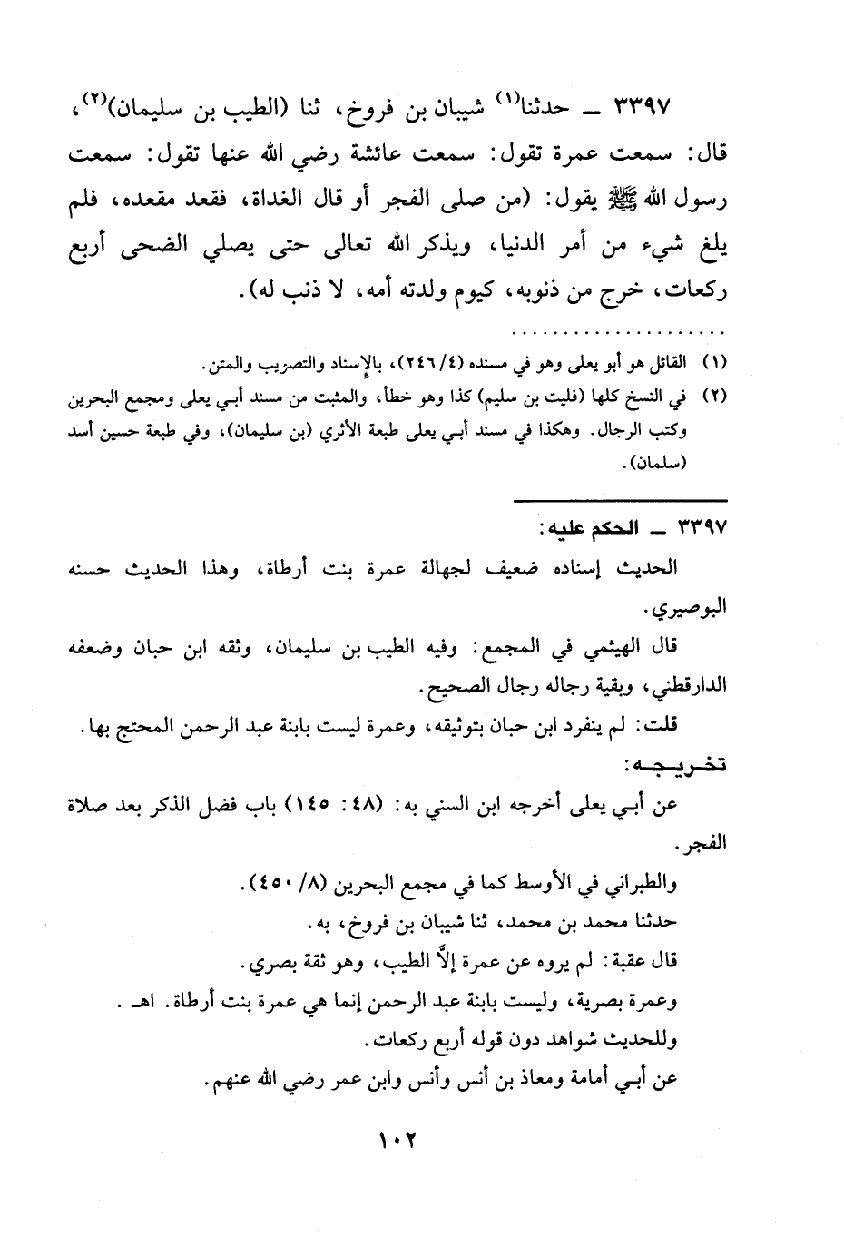 3397 - حدثنا شَيْبَانُ بْنُ فروخ، ثنا (الطيب بْنُ سليمان) ، قَالَ: سَمِعْتُ عَمْرَةَ تَقُولُ: سمعت عائشة رَضِيَ الله عَنْها تَقُولُ: سَمِعْتُ رَسُولَ اللَّهِ صَلَّى اللَّهُ عَلَيْهِ وَسَلَّمَ يَقُولُ: (§مَنْ صَلَّى الْفَجْرَ أَوْ قَالَ الْغَدَاةَ، فَقَعَدَ مَقْعَدَهُ، فلم يلغ شيء مِنْ أَمْرِ الدُّنْيَا، ويذكر الله تعالى حَتَّى يُصَلِّي الضُّحَى أَرْبَعَ رَكَعَاتٍ، خَرَجَ مِنْ ذُنُوبِهِ، كَيَوْمَ وَلَدَتْهُ أُمُّهُ، لَا ذَنْبَ لَهُ) .