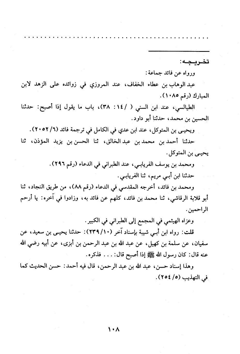 قلت: رواه ابن أبي شيبة بإسناد آخر (10/ 239): حدّثنا يحيى بن سعيد، عن سفيان، عن سلمة بن كهيل، عَنْ عَبْدِ اللَّهِ بْنِ عَبْدِ الرَّحْمَنِ بْنِ أبزى، عَنْ أَبِيهِ رَضِيَ اللَّهُ عَنْهُ قَالَ: كَانَ رسول -صلى الله عليه وسلم- إذا أصبح قال: ... فذكره.