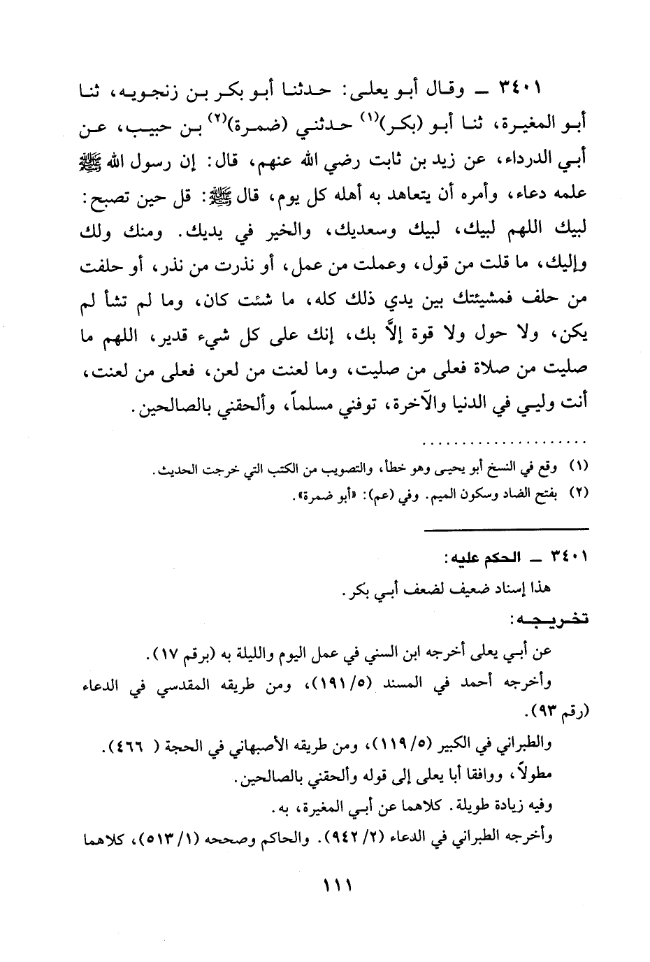 3401 - وقال أَبُو يَعْلَى: حدثنا أَبُو بَكْرِ بن زنجويه، ثنا أبو المغيرة، ثنا أبو (بَكْرٌ) حَدَّثَنِي (ضَمْرَةُ) بْنُ حَبِيبٍ، عَنْ أَبِي الدَّرْدَاءِ، عَنْ زَيْدِ بن ثابت رَضِيَ الله عَنْهم، قَالَ: إِنَّ رَسُولَ اللَّهِ صَلَّى اللَّهُ عَلَيْهِ وَسَلَّمَ عَلَّمَهُ دُعَاءً، وَأَمَرَهُ أَنْ يَتَعَاهَدَ بِهِ أَهْلَهُ كُلَّ يَوْمٍ، قَالَ صَلَّى اللَّهُ عَلَيْهِ وَسَلَّمَ: §قُلْ حِينَ تُصْبِحُ: لَبَّيْكَ اللَّهُمَّ لَبَّيْكَ، لَبَّيْكَ وَسَعْدَيْكَ، وَالْخَيْرُ فِي يَدَيْكَ. وَمِنْكَ وَلَكَ وَإِلَيْكَ، مَا قُلْتُ مِنْ قَوْلٍ، وعملت مِنْ عَمَلٍ، أَوْ نَذَرْتُ مِنْ نَذْرٍ، أَوْ حَلَفْتُ مِنْ حَلِفٍ فَمَشِيئَتُكَ بَيْنَ يَدَيْ ذَلِكَ كُلِّهِ، مَا شِئْتَ كَانَ، وَمَا لَمْ تَشَأْ لَمْ يَكُنْ، وَلَا حَوْلَ وَلَا قُوَّةَ إِلَّا بِكَ، إِنَّكَ عَلَى كُلِّ شَيْءٍ قَدِيرٌ، اللَّهُمَّ مَا صَلَّيْتُ مِنْ صَلَاةٍ فَعَلَى مَنْ صَلَّيْتُ، وَمَا لَعَنْتُ مِنْ لَعِنٍ، فَعَلَى مَنْ لَعَنْتُ، أَنْتَ وَلِيِّي فِي الدُّنْيَا وَالْآخِرَةِ، تَوَفَّنِي مُسْلِمًا، وَأَلْحِقْنِي بِالصَّالِحِينَ.