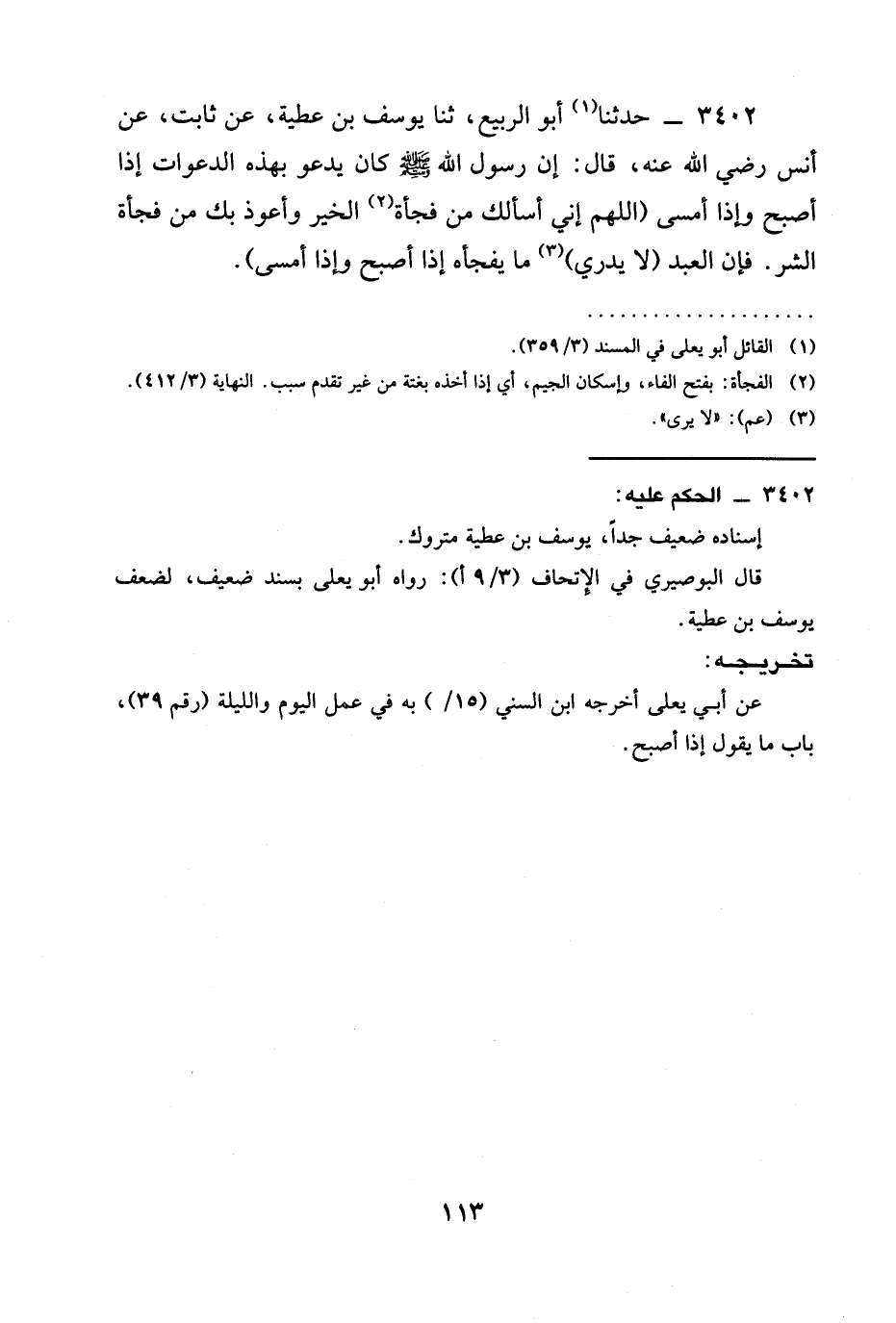 3402 - حَدَّثَنَا أَبُو الربِيعٍ، ثنا يُوسُفُ بْنُ عَطِيَّةَ، عَنْ ثَابِتٍ، عَنْ أَنَسٍ رَضِيَ الله عَنْهُ، قَالَ: إِنَّ رَسُولَ اللَّهِ صَلَّى اللَّهُ عَلَيْهِ وَسَلَّمَ كَانَ §يَدْعُو بِهَذِهِ الدَّعَوَاتِ إِذَا أَصْبَحَ وَإِذَا أَمْسَى (اللَّهُمَّ إِنِّي أَسْأَلُكَ مِنْ فَجْأَةِ الْخَيْرِ وَأَعُوذُ بِكَ مِنْ فَجْأَةِ الشَّرِّ. فَإِنَّ الْعَبْدَ (لَا يَدْرِي) مَا يَفْجَأُهُ إِذَا أَصْبَحَ وَإِذَا أَمْسَى) .