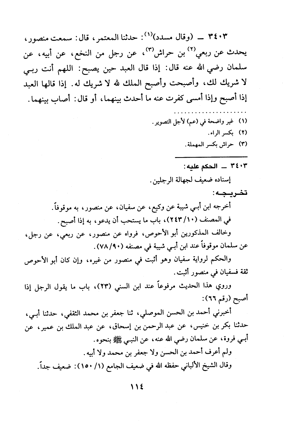 3403 - (وَقَالَ مُسَدَّدٌ) : حدثنا الْمُعْتَمِرُ، قَالَ: سَمِعْتُ منصور، يُحَدِّثُ عَنْ رِبْعِيِّ بْنِ حِرَاشٍ، عَنْ رَجُلٍ مِنَ النَّخَعِ، عَنْ أَبِيهِ، عَنْ سَلْمَانَ رَضِيَ الله عَنْه قَالَ: §إِذَا قَالَ الْعَبْدُ حِينَ يُصْبِحُ: اللَّهُمَّ أَنْتَ رَبِّي لَا شَرِيكَ لَكَ، وأصبحت وَأَصْبَحَ الْمُلْكُ لِلَّهِ لَا شَرِيكَ لَهُ. إِذَا قَالَهَا الْعَبْدُ إِذَا أَصْبَحَ وَإِذَا أَمْسَى كَفَّرَتْ عَنْهُ مَا أَحْدَثَ بَيْنَهُمَا، أَوْ قَالَ: أَصَابَ بَيْنَهُمَا.