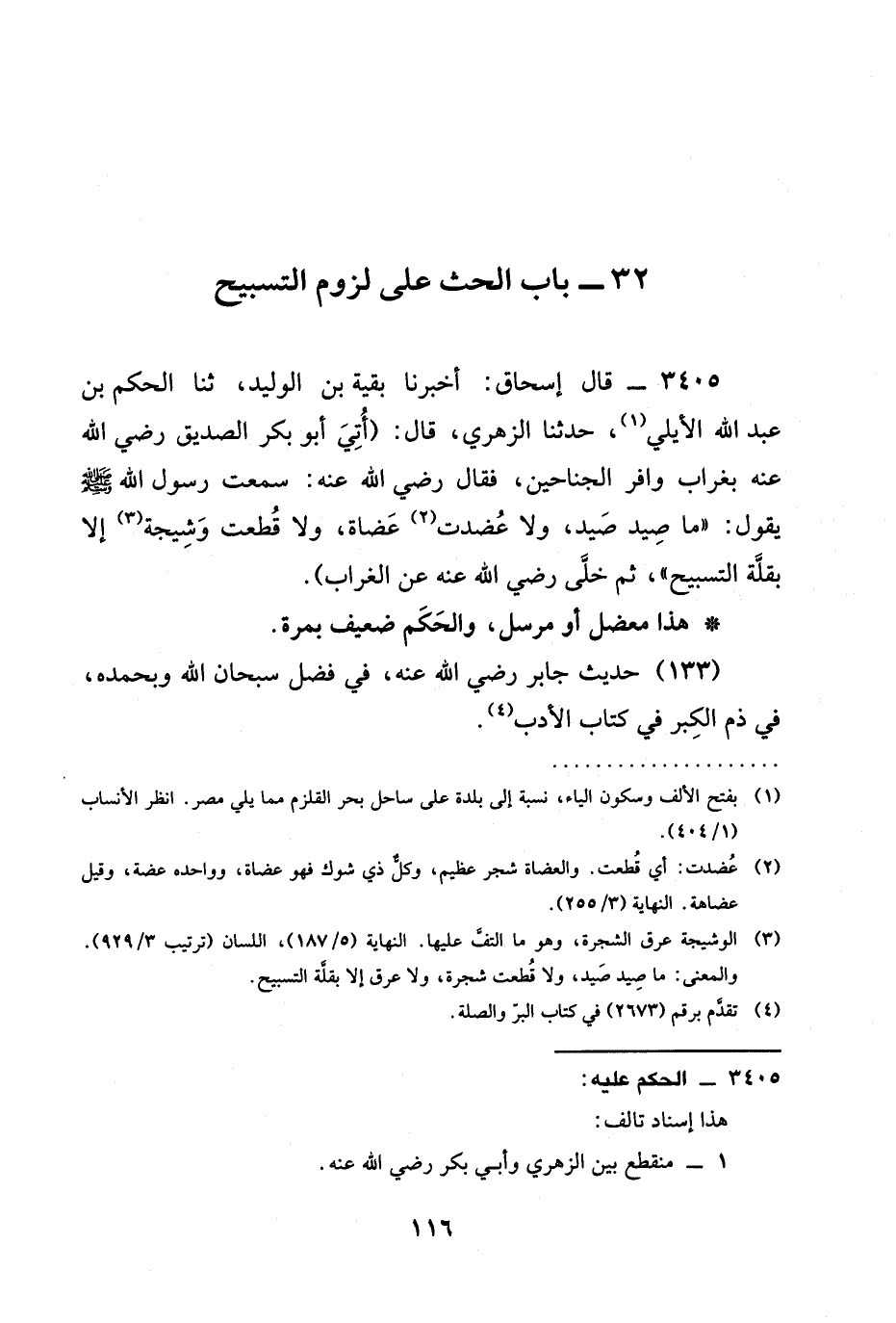 3405 - قال إسحاق: أخبرنا بَقِيَّةُ بْنُ الْوَلِيدِ، ثنا الْحَكَمُ بْنُ عَبْدِ اللَّهِ الْأَيْلِيُّ، حدثنا الزُّهْرِيُّ، قَالَ: (أُتِيَ أَبُو بَكْرٍ الصِّدِّيقُ رَضِيَ الله عَنْه بِغُرَابٍ وَافِرِ الْجَنَاحَيْنِ، فَقَالَ رَضِيَ الله عَنْه: سَمِعْتُ رَسُولَ اللَّهِ صَلَّى اللَّهُ عَلَيْهِ وَسَلَّمَ يَقُولُ: " §مَا صِيدِ صَيْدٌ، وَلَا عُضِّدَتْ عِضَاةٌ، وَلَا قُطِعَتْ وَشِيجَةٌ إِلَّا بِقِلَّةِ التَّسْبِيحِ "، ثُمَّ خَلَّى رَضِيَ الله عَنْه عَنِ الْغُرَابِ) .