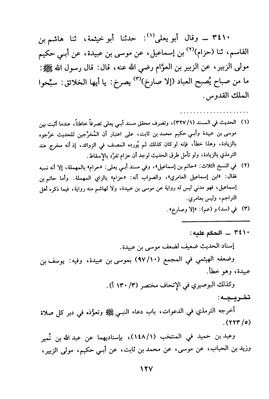 3410 - وَقَالَ أَبُو يَعْلَى: حدثنا أَبُو خَيْثَمَةَ، ثنا هَاشِمُ بْنُ الْقَاسِمِ، ثنا (حِزَامُ) بْنُ إِسْمَاعِيلَ، عَنْ مُوسَى بْنِ عُبَيْدَةَ، عَنْ أَبِي حَكِيمٍ مَوْلَى الزُّبَيْرِ، عَنِ الزُّبَيْرِ بْنِ الْعَوَّامِ رَضِيَ الله عَنْه، قَالَ: قَالَ رَسُولُ اللَّهِ صَلَّى اللَّهُ عَلَيْهِ وَسَلَّمَ: §مَا مِنْ صَبَاحٍ يُصْبِحُ الْعِبَادُ (إِلَّا صارخ) يَصْرُخُ: يَا أَيُّهَا الْخَلَائِقُ: سَبِّحُوا الْمَلِكَ الْقُدُّوسَ.