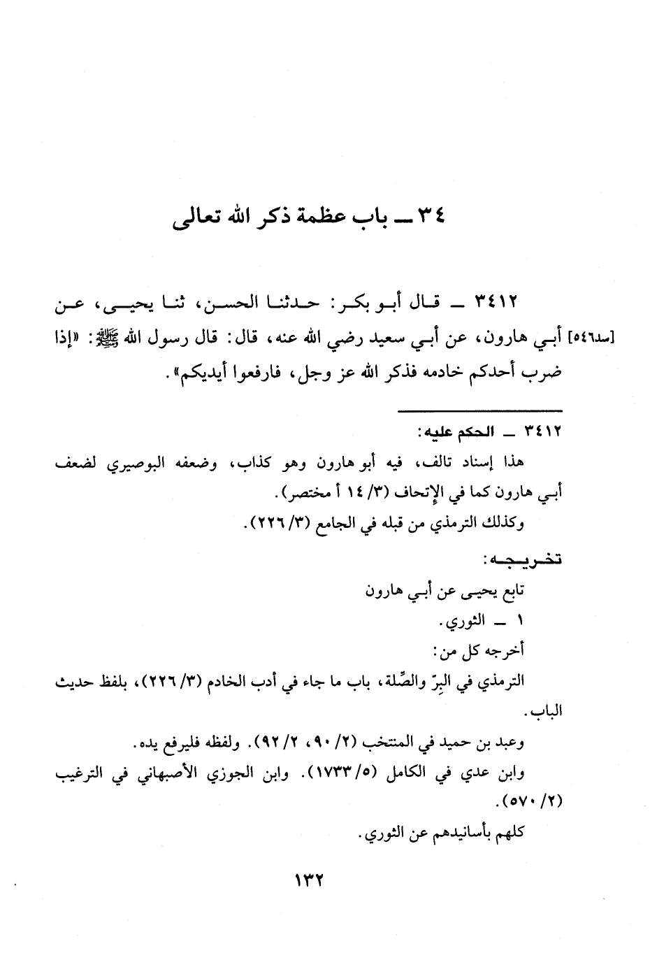 3412 - قَالَ أَبُو بَكْرِ: حدثنا الْحَسَنُ، ثنا يَحْيَى، عَنْ أَبِي هَارُونَ، عَنْ أَبِي سَعِيدٍ رَضِيَ الله عَنْه، قَالَ: قَالَ رَسُولُ اللَّهِ صَلَّى اللَّهُ عَلَيْهِ وَسَلَّمَ: " §إِذَا ضَرَبَ أَحَدُكُمْ خَادِمَهُ فذكر الله عز وجل، فَارْفَعُوا أَيْدِيكُمْ ".
