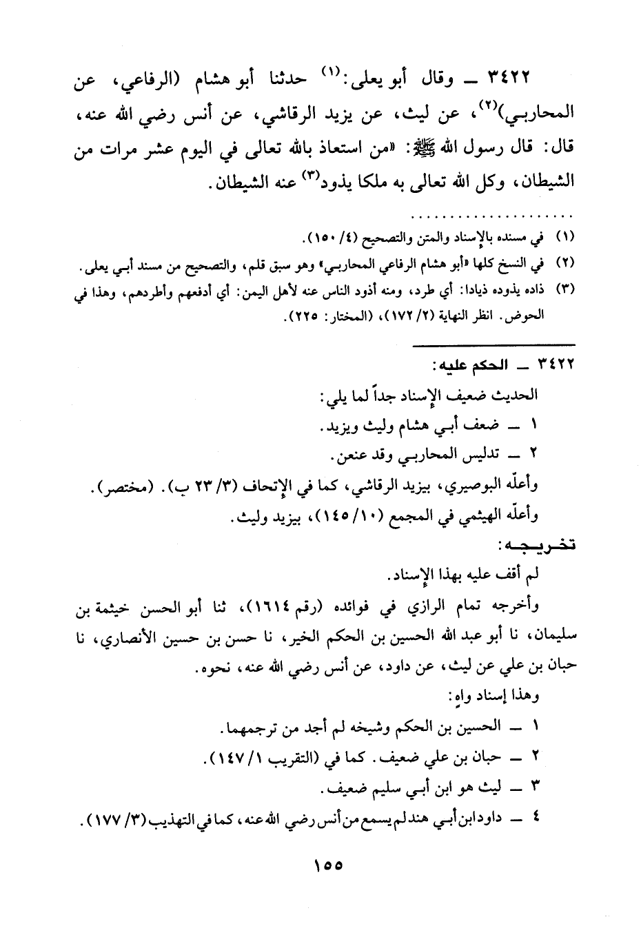 3422 - وَقَالَ أَبُو يَعْلَى: حدثنا أَبُو هِشَامٍ (الرفاعي، عن الْمُحَارِبِيُّ) ، عَنْ لَيْثٍ، عَنْ يَزِيدَ الرَّقَاشِيِّ، عَنْ أَنَسٍ رَضِيَ الله عَنْه، قَالَ: قَالَ رَسُولُ اللَّهِ صَلَّى اللَّهُ عَلَيْهِ وَسَلَّمَ: " §مَنِ استعاذ بالله تعالى فِي الْيَوْمِ عَشْرَ مَرَّاتٍ مِنَ الشَّيْطَانِ، وكل الله تعالى بِهِ مَلَكًا يَذُودُ عَنْهُ الشَّيْطَانَ.