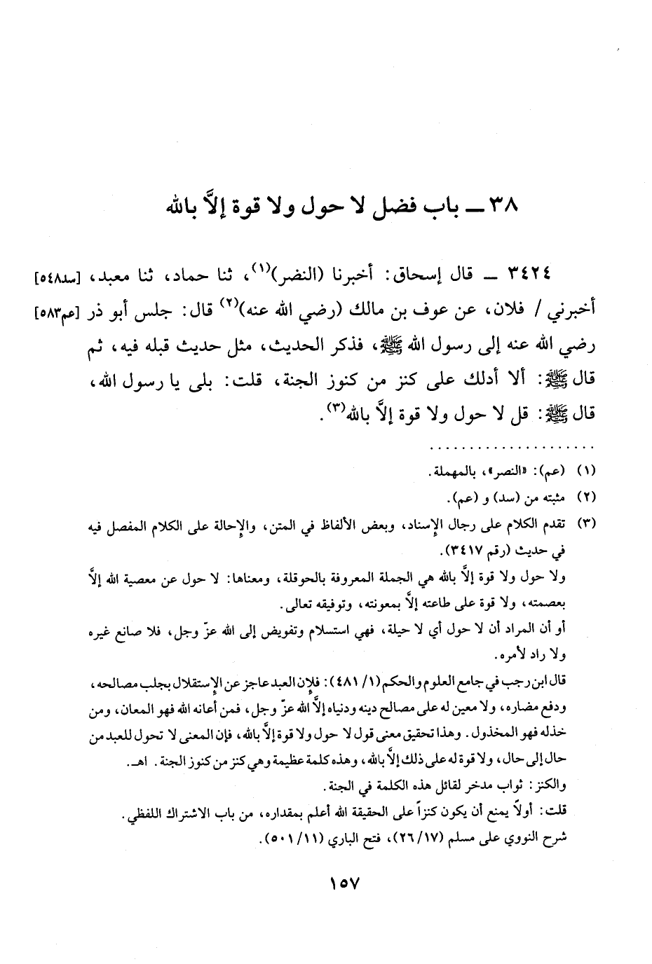 3424 - قَالَ إِسْحَاقُ: أخبرنا (النَّضْرُ) ، ثنا حَمَّادٌ، ثنا مَعْبَدٌ، أَخْبَرَنِي / فُلَانٌ، عَنْ عَوْفِ بْنِ مَالِكٍ (رَضِيَ الله عَنْه) قَالَ: جَلَسَ أَبُو ذَرٍّ رَضِيَ الله عَنْه إِلَى رَسُولِ اللَّهِ صَلَّى اللَّهُ عَلَيْهِ وَسَلَّمَ، فَذَكَرَ الْحَدِيثَ، مِثْلَ حَدِيثٍ قَبْلَهُ فِيهِ، ثُمَّ قَالَ صَلَّى اللَّهُ عَلَيْهِ وَسَلَّمَ: §أَلَا أَدُلُّكَ عَلَى كَنْزٍ مِنْ كنوز الجنة، قلت: بَلَى يَا رَسُولَ اللَّهِ، قَالَ صَلَّى اللَّهُ عَلَيْهِ وَسَلَّمَ: قُلْ لَا حَوْلَ وَلَا قُوَّةَ إِلَّا بِاللَّهِ.