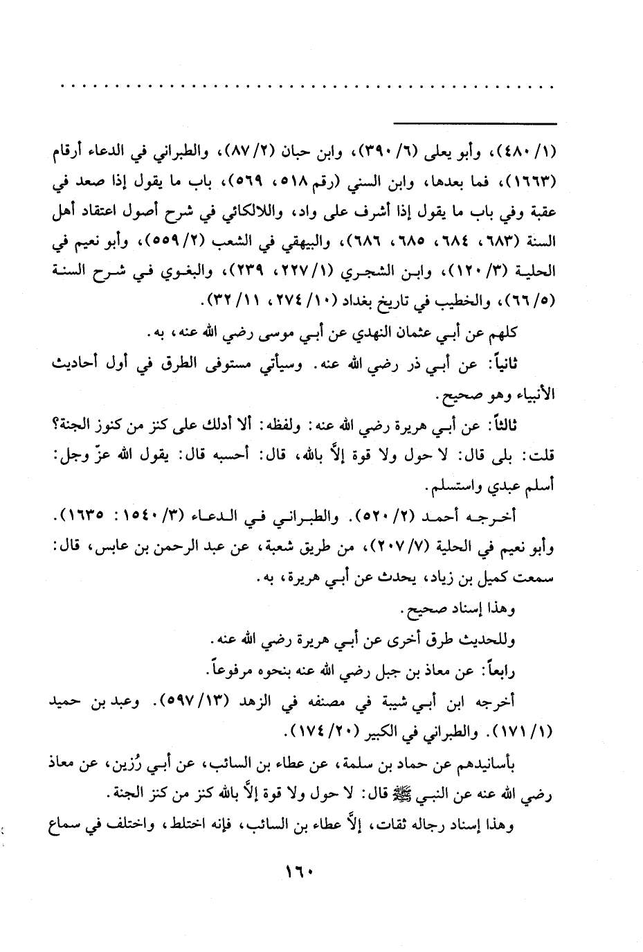 بأسانيدهم عَنْ حَمَّادُ بْنُ سَلَمَةَ، عَنْ عَطَاءِ بْنِ السَّائِبِ، عن أبي رُزين، عَنْ مُعَاذٍ رَضِيَ اللَّهُ عَنْهُ عَنِ النَّبِيِّ -صَلَّى اللَّهُ عَلَيْهِ وَسَلَّمَ- قَالَ: لَا حَوْلَ وَلَا قُوَّةَ إلَّا بِاللَّهِ كنز من كنز الجنة.