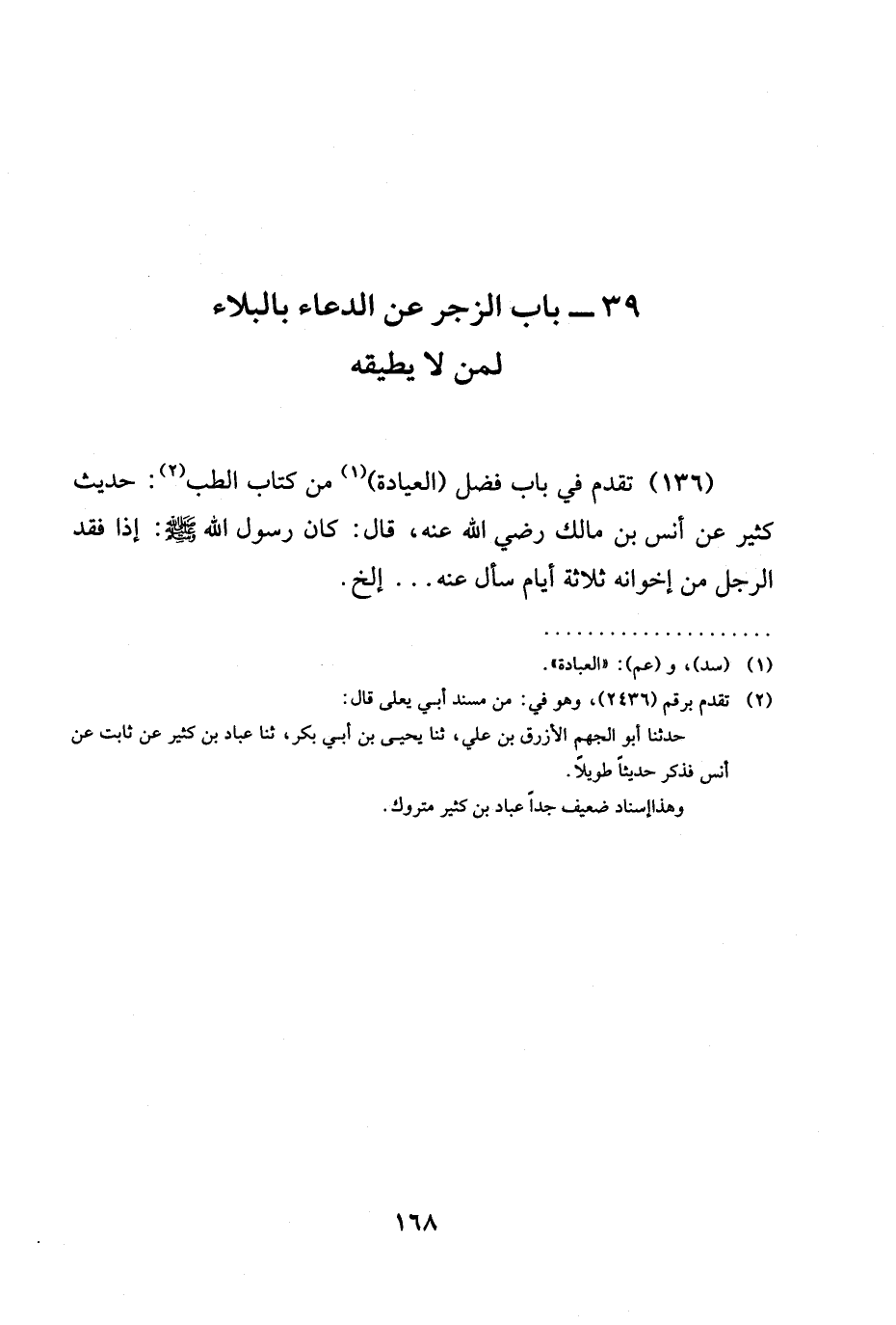 (136) تَقَدَّمَ فِي بَابِ فَضْلِ (الْعِيَادَةِ) مِنْ كِتَابِ الطِّبِّ: حَدِيثُ كَثِيرٍ عَنْ أَنَسِ بْنِ مَالِكٍ رَضِيَ الله عَنْهُ، قَالَ: كَانَ رَسُولُ اللَّهِ صَلَّى اللَّهُ عَلَيْهِ وَسَلَّمَ: إِذَا فَقَدَ الرَّجُلَ مِنْ إِخْوَانِهِ ثَلَاثَةَ أَيَّامٍ سَأَلَ عَنْهُ ... الخ.