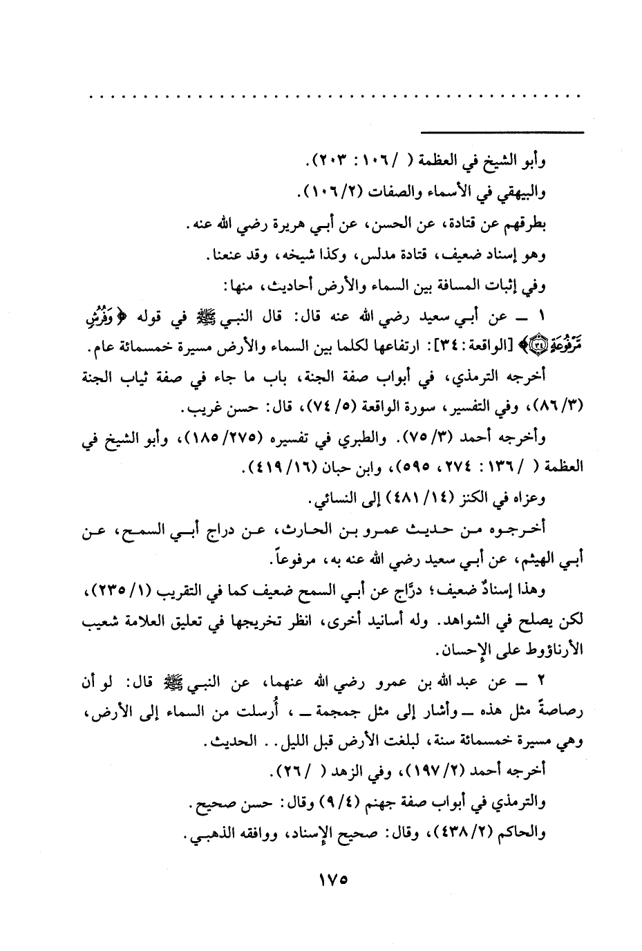 2 - عَنْ عَبْدِ اللَّهِ بْنِ عَمْرٍو رَضِيَ اللَّهُ عنهما، عَنِ النَّبِيِّ -صَلَّى اللَّهُ عَلَيْهِ وَسَلَّمَ- قَالَ: لو أن رصاصةً مثل هذه -وأشار إلى مثل جمجمة-، أُرسلت من السماء إلى الأرض، وهي مسيرة خمسمائة سنة، لبلغت الأرض قبل الليل .. الحديث.