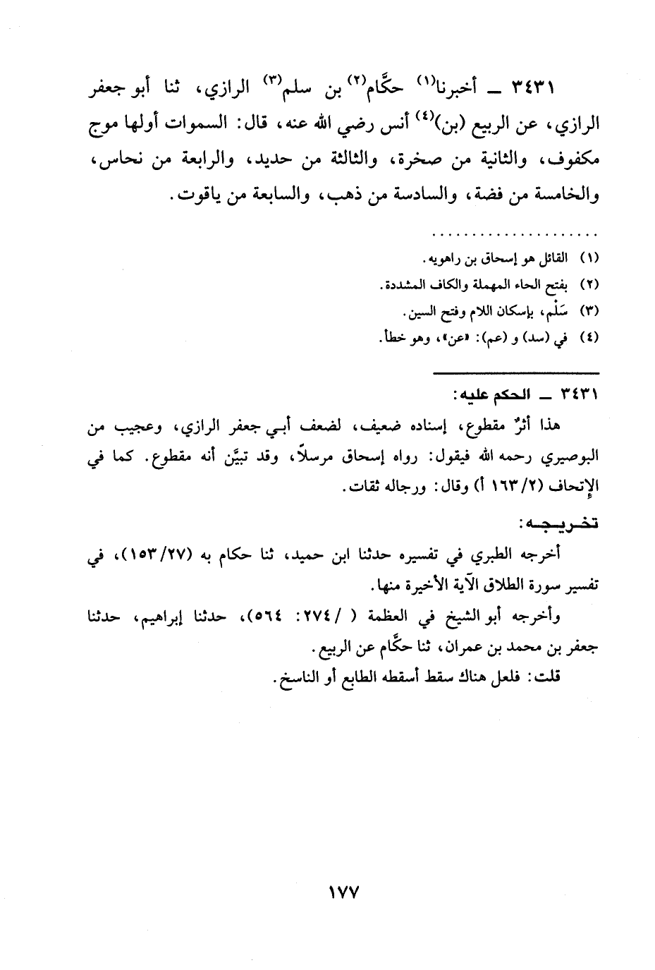 3431 - أخبرنا حَكَّامُ بْنُ سَلْمٍ الرَّازِيُّ، ثنا أَبُو جَعْفَرٍ الرَّازِيُّ، عَنِ الرَّبِيعِ (بْنِ) أَنَسٍ رَضِيَ الله عَنْه، قَالَ: §السَّمَاوَاتُ أَوَّلُهَا مَوْجٌ مَكْفُوفٌ، والثانية من صخرة، وَالثَّالِثَةُ مِنْ حَدِيدٍ، وَالرَّابِعَةُ مِنْ نُحَاسٍ، وَالْخَامِسَةُ مِنْ فِضَّةٍ، وَالسَّادِسَةُ مِنْ ذَهَبٍ، وَالسَّابِعَةُ مِنْ يَاقُوتٍ.