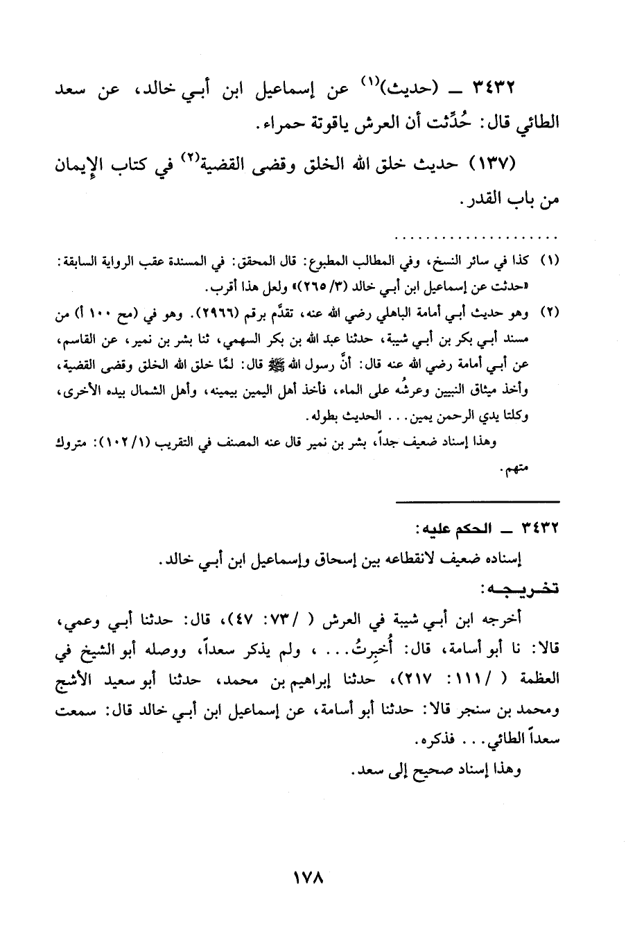 3432 - (حديث) عَنْ إِسْمَاعِيلَ ابن أَبِي خَالِدٍ، عَنْ سَعْدٍ الطَّائِيِّ قَالَ: حُدِّثْتُ §أَنَّ الْعَرْشَ يَاقُوتَةٌ حَمْرَاءُ.