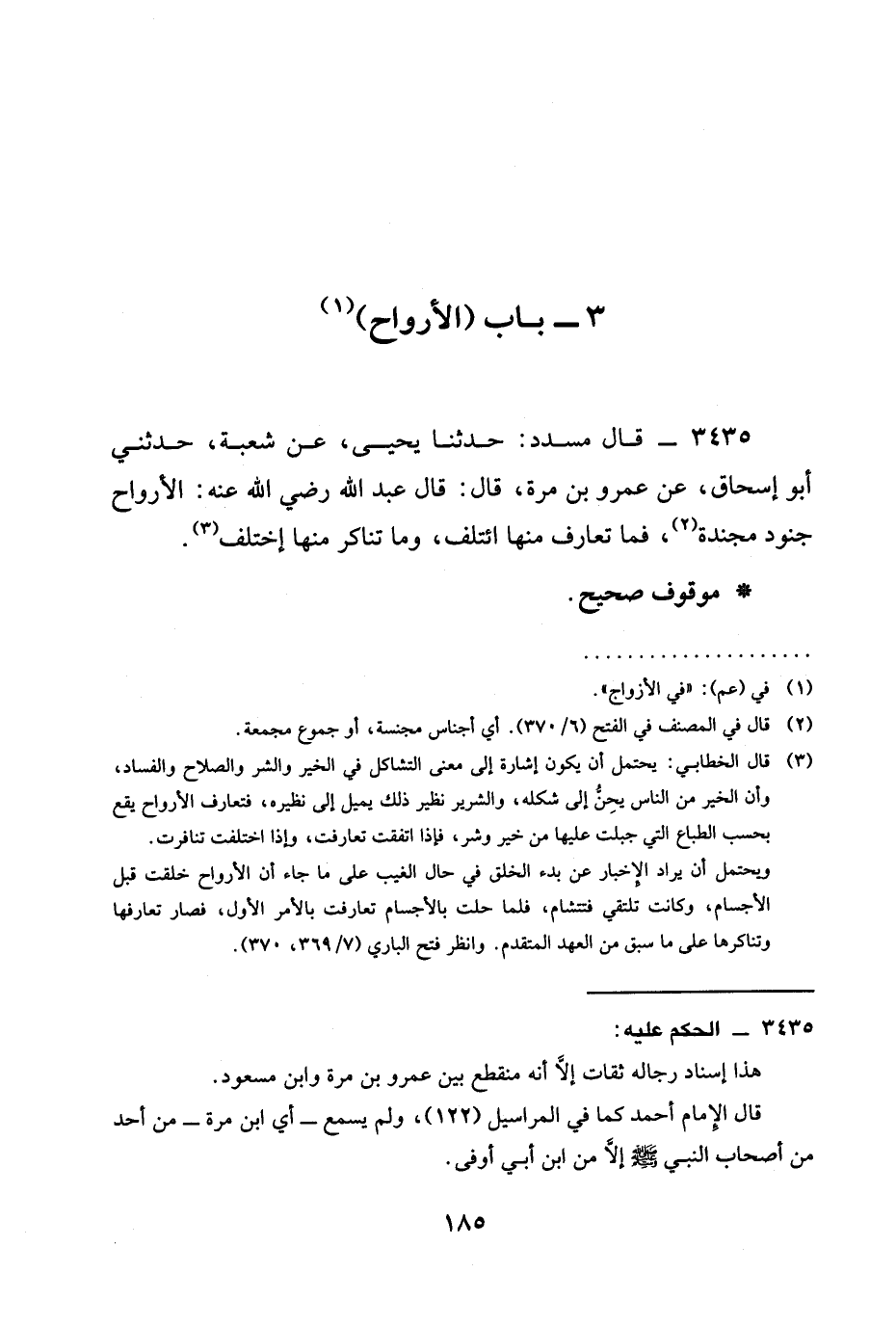 3435 - قَالَ مُسَدَّدٌ: حدثنا يَحْيَى، عَنْ شُعْبَةَ، حَدَّثَنِي أَبُو إِسْحَاقَ، عَنْ عَمْرِو بْنِ مُرَّةَ، قَالَ: قَالَ عَبْدُ اللَّهِ رَضِيَ الله عَنْه: §الْأَرْوَاحُ جُنُودٌ مُجَنَّدَةٌ، فَمَا تَعَارَفَ مِنْهَا ائْتَلَفَ، وَمَا تَنَاكَرَ مِنْهَا اخْتَلَفَ.