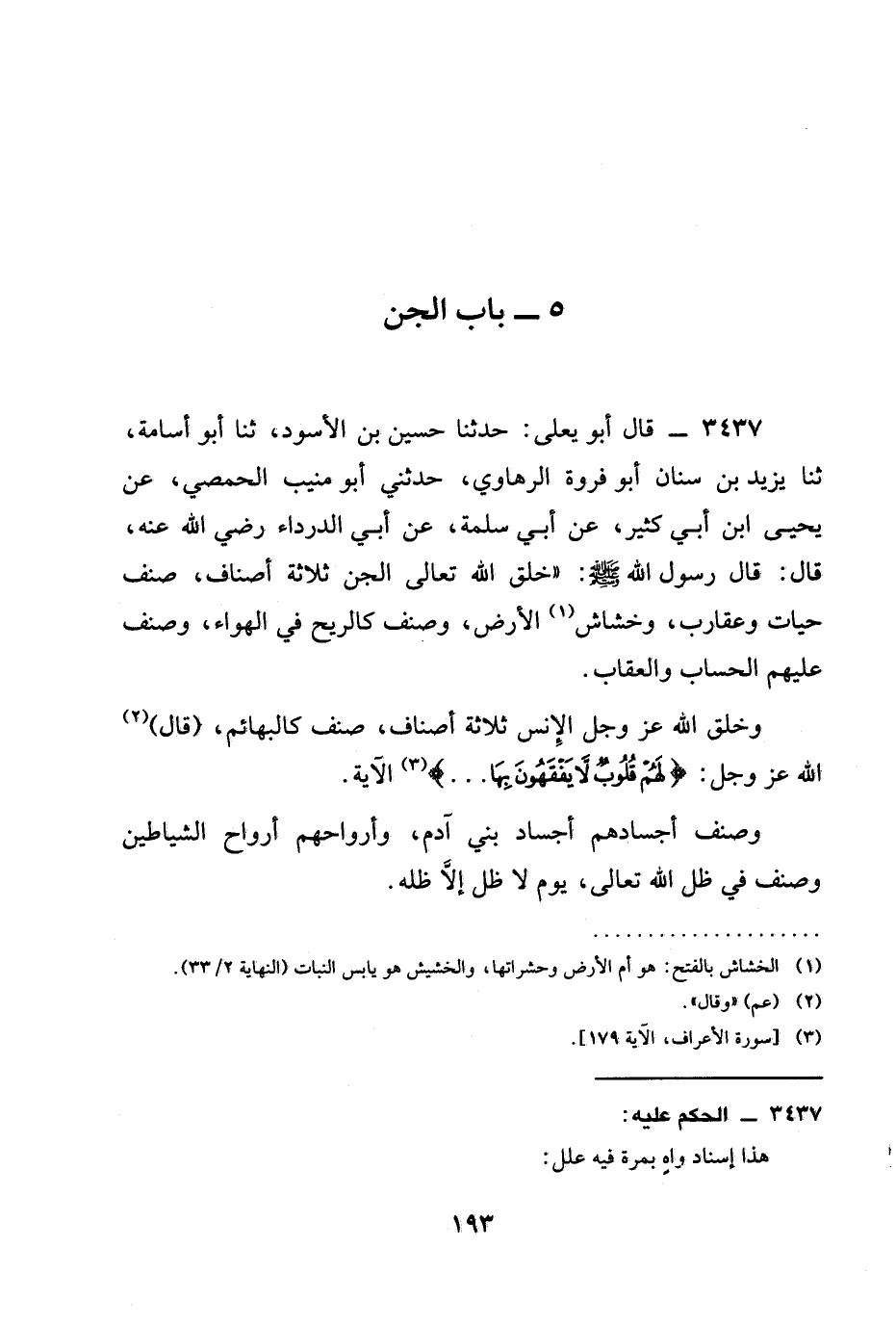 3437 - قَالَ أَبُو يَعْلَى: حدثنا حُسَيْنُ بْنُ الْأَسْوَدِ، ثنا أَبُو أُسَامَةَ، ثنا يَزِيدُ بْنُ سِنَانٍ أَبُو فَرْوَةَ الرَّهَاوِيُّ، حَدَّثَنِي أَبُو مُنِيبٍ الْحِمْصِيُّ، عَنْ يَحْيَى ابن أَبِي كَثِيرٍ، عَنْ أَبِي سَلَمَةَ، عَنْ أَبِي الدَّرْدَاءِ رَضِيَ الله عَنْه، قَالَ: قَالَ رَسُولُ اللَّهِ صَلَّى اللَّهُ عَلَيْهِ وَسَلَّمَ: " §خلق الله تعالى الجن ثلاثة أَصْنَافٍ، صِنْفٌ حَيَّاتٌ وَعَقَارِبُ، وَخَشَاشُ الْأَرْضِ، وَصِنْفٌ كَالرِّيحِ فِي الْهَوَاءِ، وَصِنْفٌ عَلَيْهِمُ الْحِسَابُ وَالْعِقَابُ.