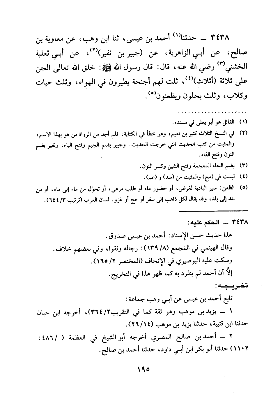 3438 - حدثنا أَحْمَدُ بْنُ عِيسَى، ثنا ابْنُ وَهْبٍ، عَنْ مُعَاوِيَةَ بْنِ صَالِحٍ، عَنْ أَبِي الزاهرية، عن (جبير بن نفير) ، عَنْ أبي ثعلبة الخشني رَضِيَ الله عَنْه، قَالَ: قَالَ رَسُولُ اللَّهِ صَلَّى اللَّهُ عَلَيْهِ وَسَلَّمَ: §خلق الله تعالى الْجِنَّ عَلَى ثَلَاثَةِ (أثلاث) ، ثلث لَهُمْ أَجْنِحَةٌ يَطِيرُونَ فِي الْهَوَاءِ، وَثُلُثٌ حَيَّاتٌ وَكِلَابٌ، وَثُلُثٌ يَحِلُّونَ وَيَظْعَنُونَ.
