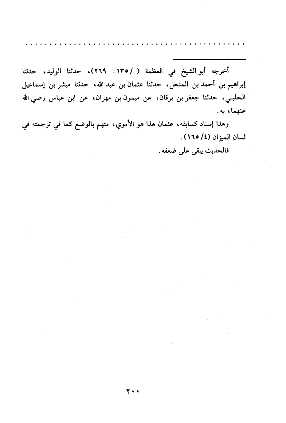 = أخرجه أبو الشيخ في العظمة (/135: 269)، حدّثنا الوليد، حدّثنا إبراهيم بن أحمد بن المنحل، حدّثنا عثمان بن عبد الله، حدّثنا مبشر بن إسماعيل الحلبي، حدّثنا جعفر بن برقان، عَنْ مَيْمُونِ بْنِ مِهْرَانَ، عَنِ ابْنِ عَبَّاسٍ رضي الله عنهما، به.
