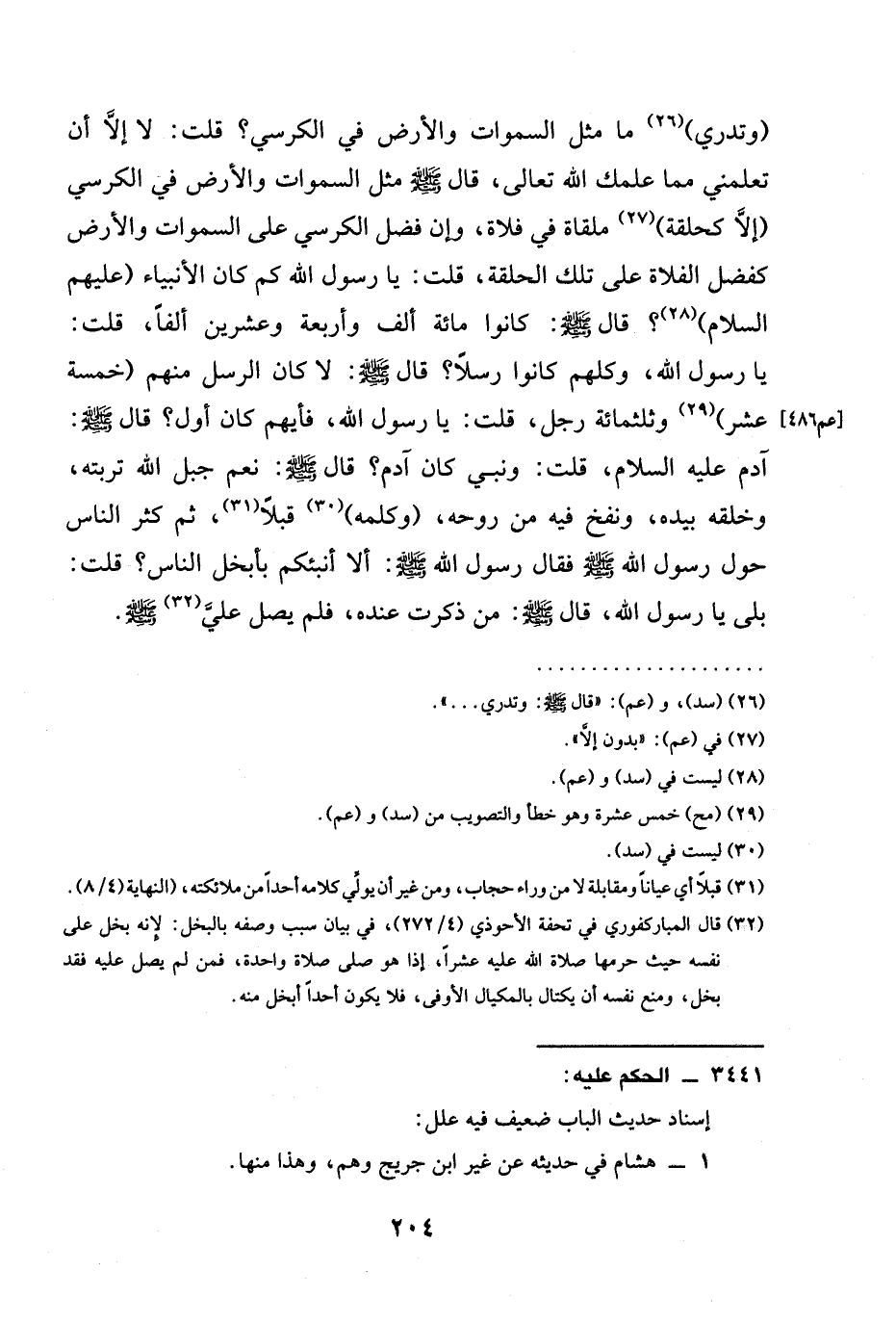 (وتدري) (¬26) ما مثل السموات وَالْأَرْضِ فِي الْكُرْسِيِّ؟ قُلْتُ: لَا إلَّا أَنْ تُعَلِّمَنِي مِمَّا عَلَّمَكَ اللَّهِ تَعَالَى، قَالَ -صَلَّى اللَّهُ عَلَيْه وَسَلَّمَ- مثل السموات والأرض في الكرسي (إلَّا كَحَلْقَةٍ) (¬27) مُلْقَاةٍ فِي فَلَاةٍ، وَإِنَّ فَضْلَ الْكُرْسِيِّ على السموات وَالْأَرْضِ كَفَضْلِ الْفَلَاةِ عَلَى تِلْكَ الْحَلْقَةِ، قُلْتُ: يَا رَسُولَ اللَّهِ كَمْ كَانَ الْأَنْبِيَاءُ (عَلَيْهِمُ السَّلَامُ) (¬28)؟ قَالَ -صَلَّى اللَّهُ عَلَيْهِ وَسَلَّمَ-: كَانُوا مِائَةَ أَلْفٍ وَأَرْبَعَةً وَعِشْرِينَ أَلْفًا، قُلْتُ: يَا رَسُولَ اللَّهِ، وَكُلُّهُمْ كَانُوا رُسُلًا؟ قَالَ -صَلَّى اللَّهُ عَلَيْهِ وَسَلَّمَ-: لَا كَانَ الرُّسُلُ مِنْهُمْ (خمسة عشر) (¬29) وثلثمائة رَجُلٍ، قُلْتُ: يَا رَسُولَ اللَّهِ، فَأَيُّهُمْ كَانَ أَوَّلَ؟ قَالَ -صَلَّى اللَّهُ عَلَيْهِ وَسَلَّمَ-: آدَمُ عَلَيْهِ السَّلَامُ، قُلْتُ: وَنَبِيٌّ كَانَ آدَمُ؟ قَالَ -صَلَّى اللَّهُ عَلَيْهِ وَسَلَّمَ-: نَعَمْ جَبَلَ اللَّهُ تُرْبَتَهُ، وَخَلَقَهُ بِيَدِهِ، وَنَفَخَ فِيهِ مِنْ رُوحِهِ، (وَكَلَّمَهُ) (¬30) قُبُلًا (¬31)، ثُمَّ كَثُرَ النَّاسُ حَوْلَ رَسُولِ اللَّهِ -صَلَّى اللَّهُ عَلَيْهِ وَسَلَّمَ- فَقَالَ رَسُولُ اللَّهِ -صَلَّى اللَّهُ عَلَيْهِ وَسَلَّمَ-: أَلَا أُنَبِّئُكُمْ بِأَبْخَلِ النَّاسِ؟ قُلْتُ: بَلَى يَا رَسُولَ اللَّهِ، قَالَ -صَلَّى اللَّهُ عَلَيْهِ وَسَلَّمَ-: مَنْ ذُكِرْتُ عِنْدَهُ، فَلَمْ يُصَلِّ علىَّ (¬32) -صَلَّى اللَّهُ عَلَيْهِ وَسَلَّمَ-.