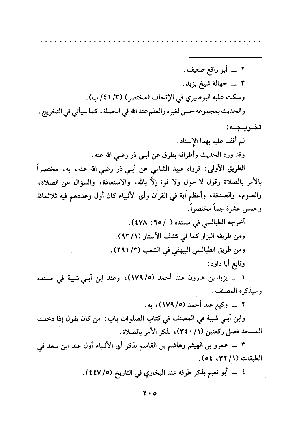 الطريق الأولى: فرواه عبيد الشامي عن أبي ذر رضي الله عنه، به، مختصرًا بالأمر بالصلاة وقول لا حول ولا قوة إلَّا بالله، والاستعاذة، والسؤال عن الصلاة، والصوم، والصدقة، وأعظم آية في القرآن وأي الأنبياء كان أول وعددهم فيه ثلاثمائة وخمس عشرة جمًا مختصرًا.