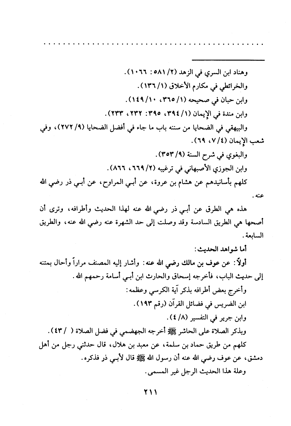 هذه هي الطرق عن أبي ذر رضي الله عنه لهذا الحديث وأطرافه، وترى أن أصحها هي الطريق السادسة وقد وصلت إلى حد الشهرة عنه رضي الله عنه، والطريق السابعة.