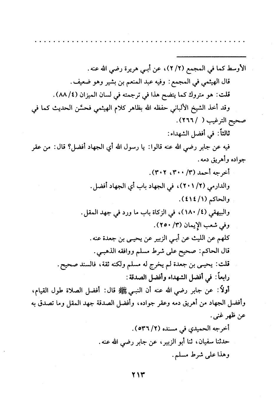 أولًا: عن جابر رَضِيَ اللَّهُ عَنْهُ أَنَّ النَّبِيَّ -صَلَّى اللَّهُ عليه وسلم- قال: أفضل الصلاة طول القيام، وأفضل الجهاد من أهريق دمه وعقر جواده، وأفضل الصدقة جهد المقل وما تصدق به عن ظهر غنى.