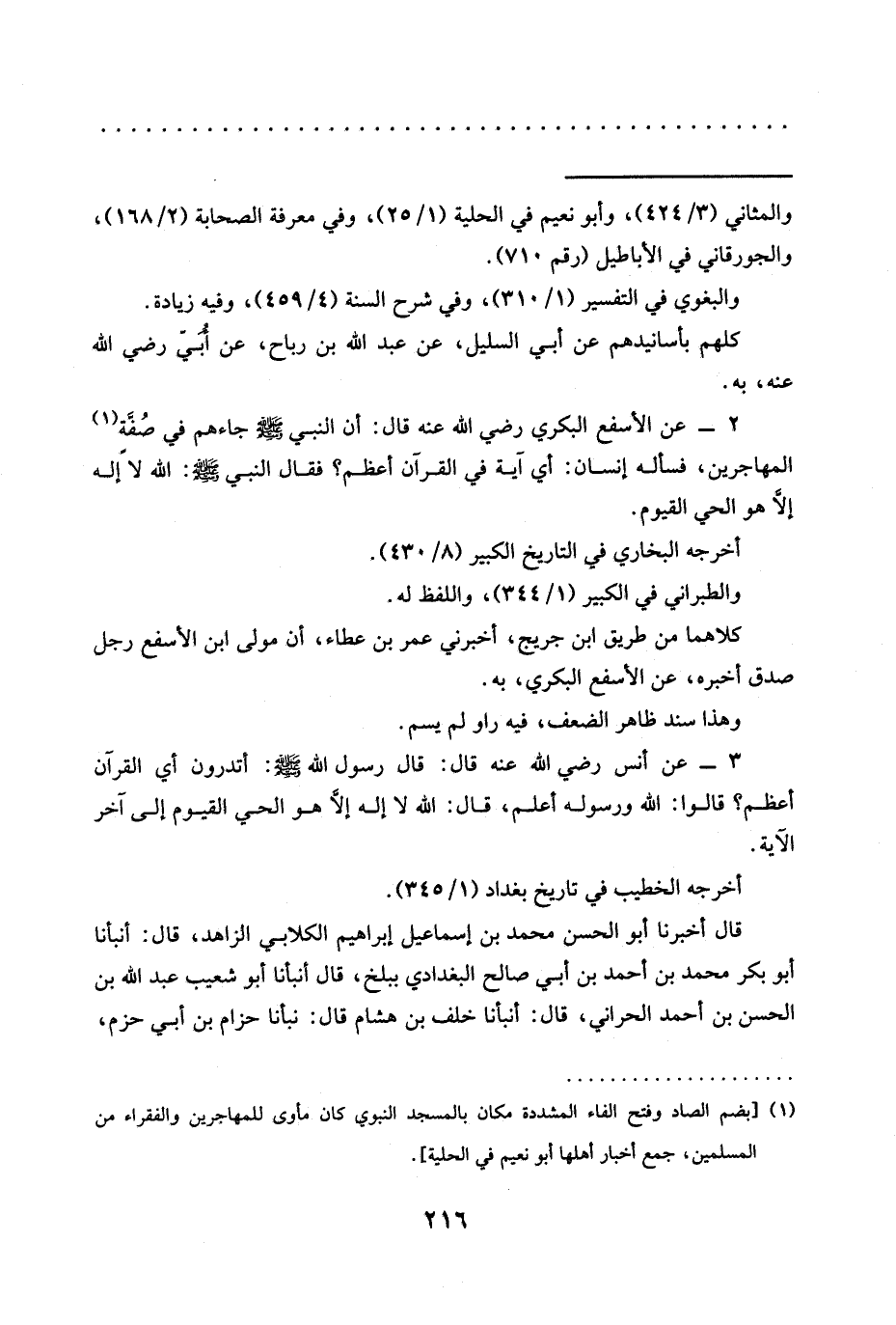 2 - عن الأسفع البكري وضي الله عنه قَالَ: إِنَّ النَّبِيَّ -صَلَّى اللَّهُ عَلَيْهِ وَسَلَّمَ- في صُفَّة (¬1) المهاجرين، فسأله إنسان: أي آية في القرآن أعظم؟ فقال النبي -صلى الله عليه وسلم-: الله لاإله إلا هو الحي القيوم.
