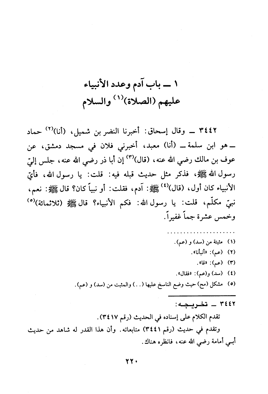 3442 - وقال إسحاق: أخبرنا النَّضْرُ بْنُ شُمَيْلٍ، (أنا) حَمَّادٌ - هُوَ ابْنُ سَلَمَةَ - (أنا) مَعْبَدٌ، أَخْبَرَنِي فُلَانٌ فِي مَسْجِدِ دِمَشْقَ، عَنْ عَوْفِ بْنِ مَالِكٍ رَضِيَ الله عَنْه، (قَالَ) إِنَّ أَبَا ذَرٍّ رَضِيَ الله عَنْه، جَلَسَ إِلَى رَسُولِ اللَّهِ صَلَّى اللَّهُ عَلَيْهِ وَسَلَّمَ، فَذَكَرَ مِثْلَ حَدِيثٍ قَبْلَهُ فِيهِ: قُلْتُ: يَا رَسُولَ اللَّهِ، §فَأَيُّ الْأَنْبِيَاءِ كَانَ أول، (قال) صَلَّى اللَّهُ عَلَيْهِ وَسَلَّمَ: آدم، فقلت: أو نبيا كَانَ؟ قَالَ صَلَّى اللَّهُ عَلَيْهِ وَسَلَّمَ: نَعَمْ، نَبِيٌّ مُكَلَّمٌ، قُلْتُ: يَا رَسُولَ اللَّهِ: فَكَمِ الْأَنْبِيَاءُ؟ قال صَلَّى اللَّهُ عَلَيْهِ وَسَلَّمَ (ثلاثمائة) وخمس عشرة جَمًّا غَفِيرًا.