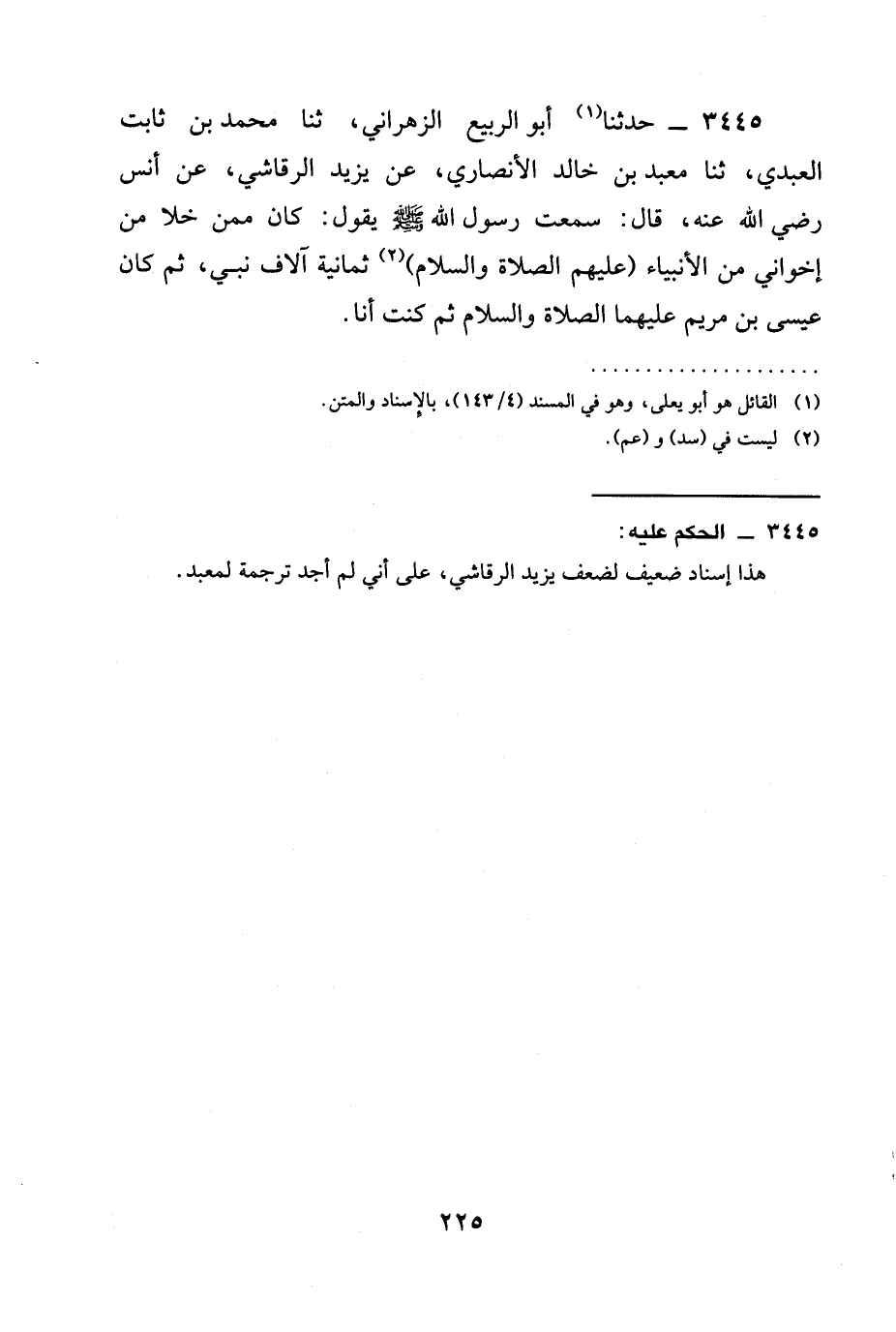 3445 - حدثنا أَبُو الرَّبِيعِ الزَّهْرَانِيُّ، ثنا مُحَمَّدُ بْنُ ثَابِتٍ الْعَبْدِيُّ، ثنا مَعْبَدُ بْنُ خَالِدٍ الْأَنْصَارِيُّ، عَنْ يَزِيدَ الرَّقَاشِيِّ، عَنْ أَنَسٍ رَضِيَ الله عَنْه، قَالَ: سَمِعْتُ رَسُولَ اللَّهِ صَلَّى اللَّهُ عَلَيْهِ وَسَلَّمَ يَقُولُ: §كَانَ مِمَّنْ خَلَا مِنْ إِخْوَانِي من الأنبياء (عليهم الصلاة والسلام) ثَمَانِيَةَ آلَافِ نَبِيٍّ، ثُمَّ كَانَ عِيسَى بن مريم عليهما الصلاة والسلام ثُمَّ كُنْتُ أَنَا.