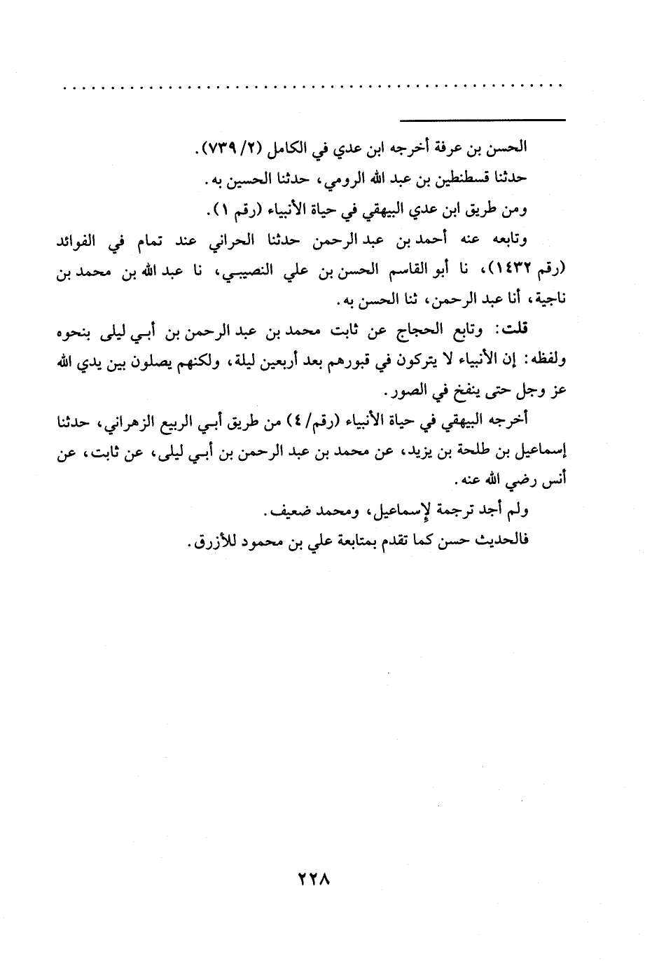 قلت: وتابع الحجاج عن ثابت مُحَمَّدُ بْنُ عَبْدِ الرَّحْمَنِ بْنِ أَبِي لِيَلَى بنحوه ولفظه: إن الأنبياء لا يتركون في قبورهم بعد أربعين ليلة، ولكنهم يصلون بين يدي الله عَزَّ وَجَلَّ حتى ينفخ في الصور.