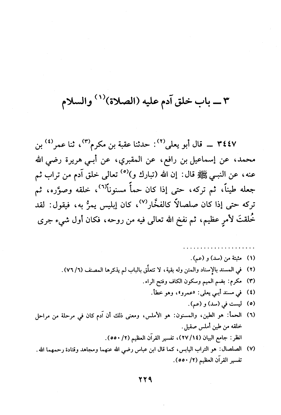 3447 - قَالَ أَبُو يَعْلَى: حدثنا عُقْبَةُ بْنُ مُكْرَمٍ، ثنا عُمَرُ بْنُ مُحَمَّدٍ، عَنْ إِسْمَاعِيلَ بْنِ رَافِعٍ، عَنِ الْمَقْبُرِيُّ، عَنْ أَبِي هُرَيْرَةَ رَضِيَ الله عَنْه، عَنِ النَّبِيِّ صَلَّى اللَّهُ عَلَيْهِ وَسَلَّمَ قَالَ: §إن الله (تبارك و) تعالى خَلَقَ آدَمَ مِنْ تُرَابٍ ثُمَّ جَعَلَهُ طِينًا، ثُمَّ تَرَكَهُ، حَتَّى إِذَا كَانَ حَمَأً مَسْنُونًا، خَلَقَهُ وَصَوَّرَهُ، ثُمَّ تَرَكَهُ حَتَّى إِذَا كَانَ صَلْصَالًا كَالْفَخَّارِ، كَانَ إِبْلِيسُ يَمُرُّ بِهِ، فَيَقُولُ: لقد خلقت لأمر عظيم، ثُمَّ نفخ الله تعالى فِيهِ مِنْ رُوحِهِ، فَكَانَ أَوَّلُ شَيْءٍ جَرَى