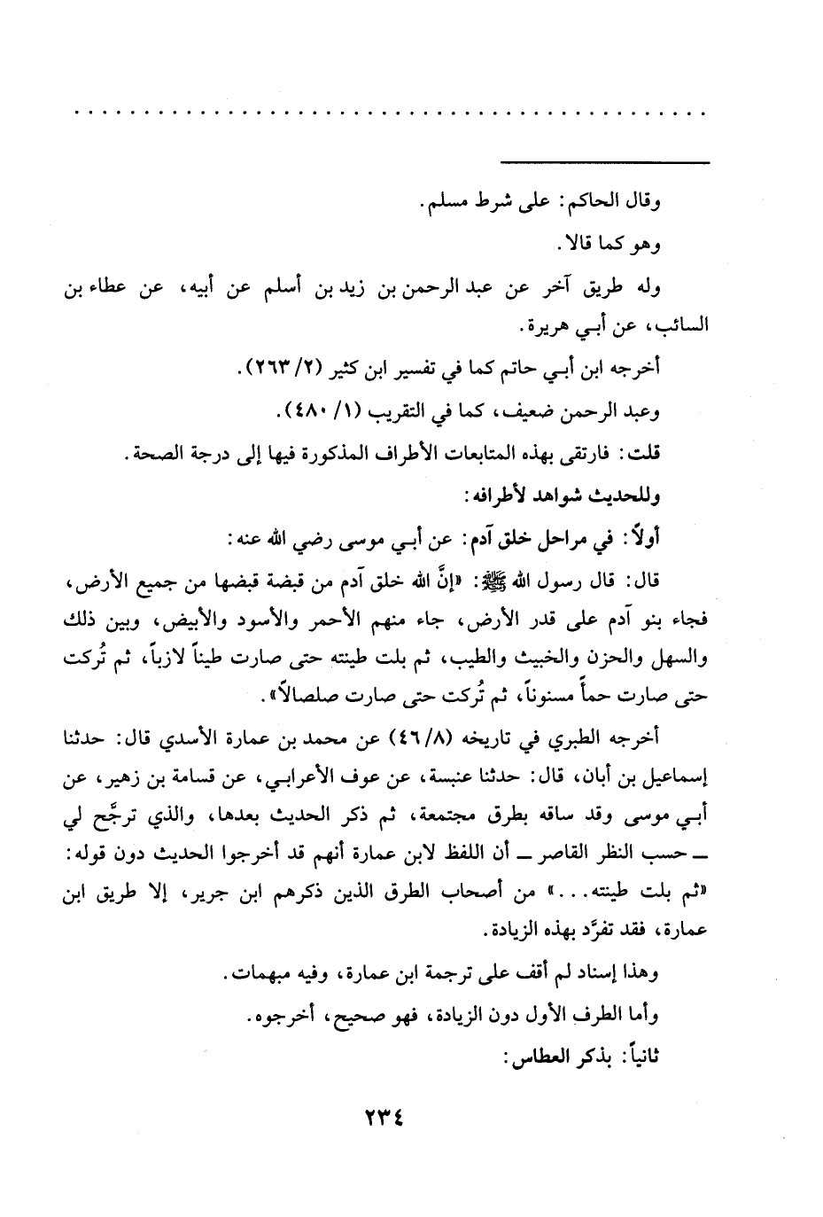 أخرجه الطبري في تاريخه (8/ 46) عن محمد بن عمارة الأسدي قال: حدّثنا إسماعيل بن أبان، قال: حدّثنا عنبسة، عن عوف الأعرابي، عن قسامة بن زهير، عن أبي موسى وقد ساقه بطرق مجتمعة، ثم ذكر الحديث بعدها، والذي ترجَّح لي -حسب النظر القاصر- أن اللفظ لابن عمارة أنهم قد أخرجوا الحديث دون قوله: " ثم بلت طينته ... " من أصحاب الطرق الذين ذكرهم ابن جرير، إلا طريق ابن عمارة، فقد تفرَّد بهذه الزيادة.
