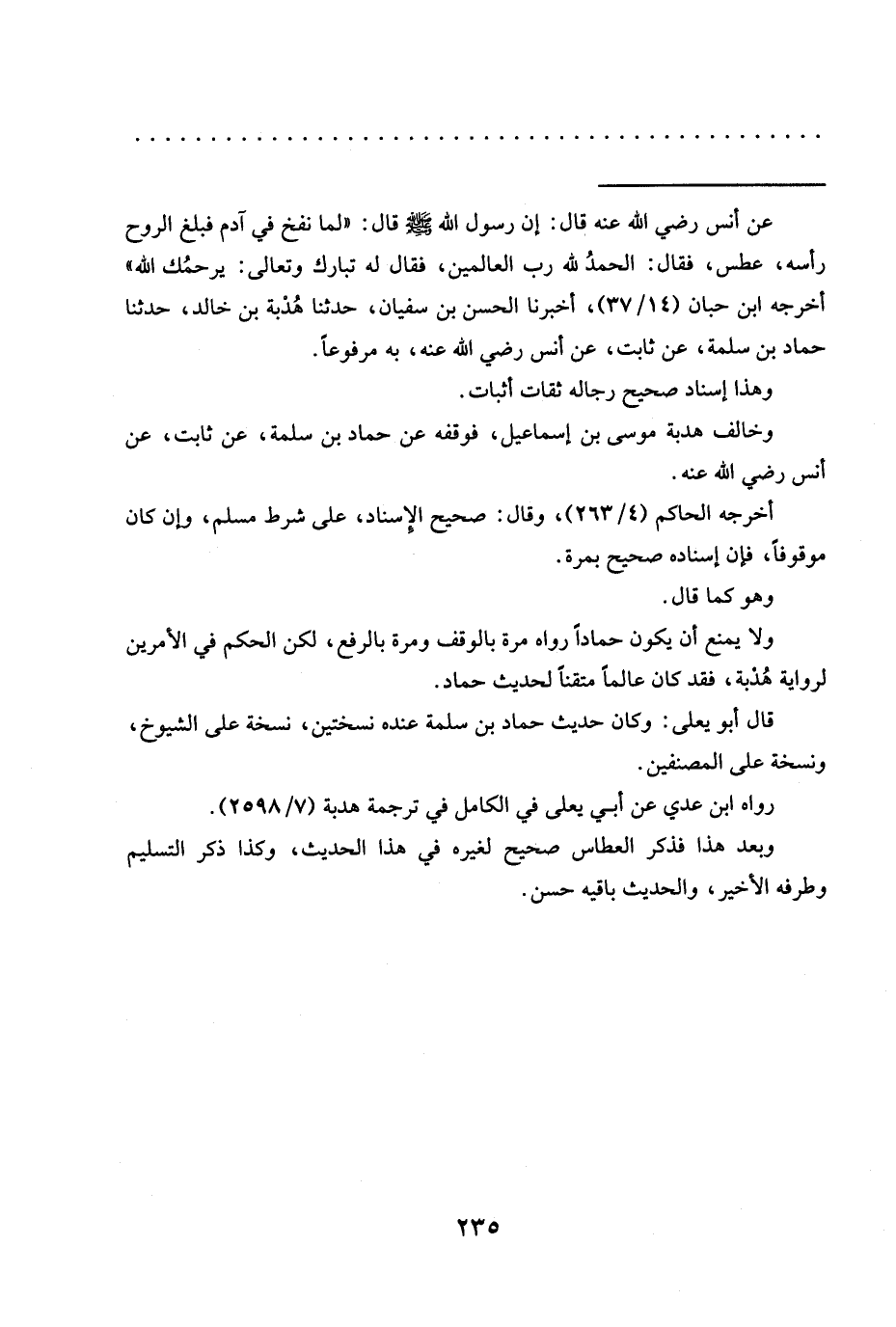 = عن أنس رَضِيَ اللَّهُ عَنْهُ قَالَ: إِنَّ رَسُولَ اللَّهِ -صلى الله عليه وسلم- قال: "لما نفخ في آدم فبلغ الروح رأسه، عطس، فقال: الحمدُ لله رب العالمين، فقال له تبارك وتعالى: يرحمُك الله" أخرجه ابن حبّان (14/ 37)، أخبرنا الحسن بن سفيان، حدّثنا هُدْبة بن خالد، حَدَّثَنَا حَمَّادُ بْنُ سَلَمَةَ، عَنْ ثَابِتٍ، عَنْ أَنَسٍ رضي الله عنه، به مرفوعًا.