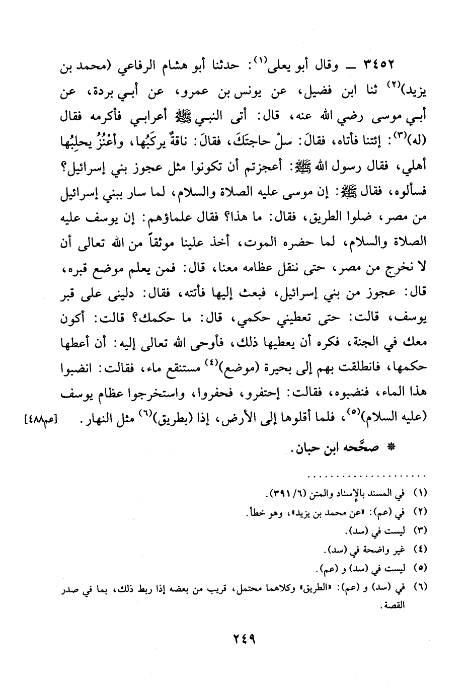 3452 - وقال أَبُو يَعْلَى: حدثنا أَبُو هِشَامٍ الرِّفَاعِيُّ (مُحَمَّدِ بْنِ يَزِيدَ) ثنا ابْنُ فُضَيْلٍ، عَنْ يُونُسَ بْنِ عَمْرٍو، عَنْ أَبِي بُرْدَةَ، عَنْ أَبِي مُوسَى رَضِيَ الله عَنْه، قَالَ: أَتَى النَّبِيَّ صَلَّى اللَّهُ عَلَيْهِ وَسَلَّمَ أَعْرَابِيٌّ فَأَكْرَمَهُ فَقَالَ (لَهُ) : ائْتِنَا فَأَتَاهُ، فَقَالَ: سَلْ حَاجَتَكَ، فَقَالَ: نَاقَةً يركبها، وأعنز يَحْلُبُهَا أَهْلِي، فَقَالَ رَسُولُ اللَّهِ صَلَّى اللَّهُ عَلَيْهِ وَسَلَّمَ: §أَعَجَزْتُمْ أَنْ تَكُونُوا مِثْلَ عَجُوزِ بَنِي إِسْرَائِيلَ؟ فَسَأَلُوهُ، فَقَالَ صَلَّى اللَّهُ عَلَيْهِ وَسَلَّمَ: إن موسى عليه الصلاة والسلام، لَمَّا سَارَ بِبَنِي إِسْرَائِيلَ من مصر، ضلوا الطَّرِيقَ، فَقَالَ: مَا هَذَا؟ فَقَالَ عُلَمَاؤُهُمْ: إن يوسف عليه الصلاة والسلام، لَمَّا حَضَرَهُ الْمَوْتُ، أَخَذَ عَلَيْنَا مَوْثِقًا من الله تعالى أن لا نَخْرُجَ مِنْ مِصْرَ، حَتَّى نَنْقُلُ عِظَامَهُ مَعَنَا، قَالَ: فَمَنْ يَعْلَمُ موضع قبره، قال: عَجُوزٌ مِنْ بَنِي إِسْرَائِيلَ، فَبَعَثَ إِلَيْهَا فَأَتَتْهُ، فَقَالَ: دُلِّينِي عَلَى قَبْرِ يُوسُفَ، قَالَتْ: حَتَّى تُعْطِيَنِي حُكْمِي، قَالَ: مَا حُكْمُكِ؟ قَالَتْ: أَكُونَ مَعَكَ فِي الْجَنَّةِ، فَكَرِهَ أَنْ يُعْطِيَهَا ذَلِكَ، فأوحى الله تعالى إِلَيْهِ: أَنْ أَعْطِهَا حُكْمَهَا، فَانْطَلَقَتْ بِهِمْ إِلَى بُحَيْرَةٍ (مَوْضِعِ) مُسْتَنْقَعِ مَاءٍ، فَقَالَتْ: أَنْضِبُوا هَذَا الْمَاءَ، فنضبوه، فَقَالَتِ: احْتَفِرُوا، فَحَفَرُوا، وَاسْتَخْرَجُوا عظام يوسف (عليه السلام) ، فَلَمَّا أَقَلُّوهَا إلى الأرض، إذا (بطريق) مِثْلُ النَّهَارِ.