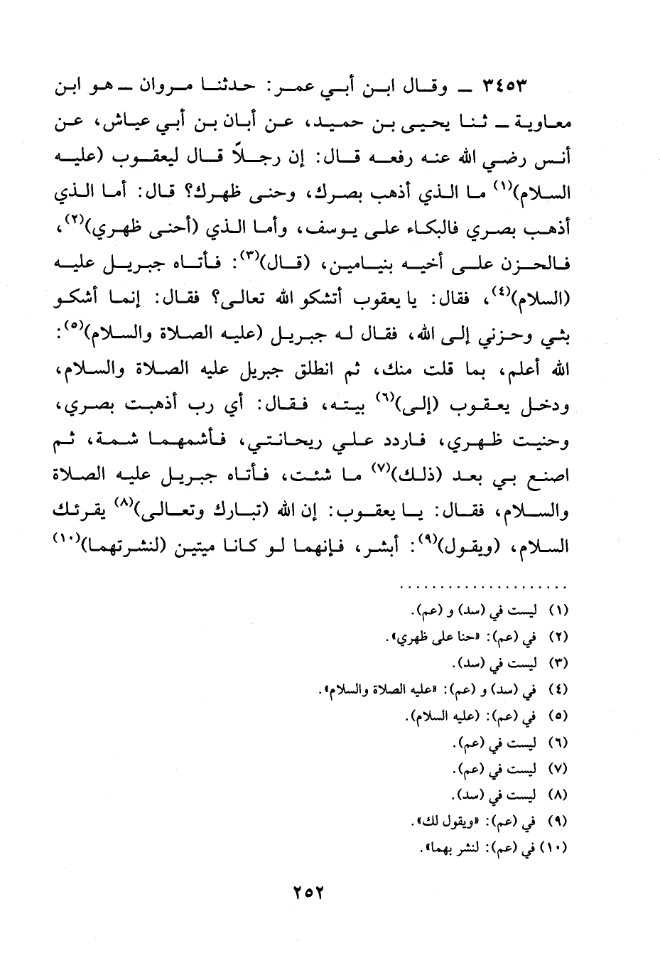 3453 - وَقَالَ ابن أَبِي عُمَرَ: حدثنا مَرْوَانُ - هُوَ ابْنُ مُعَاوِيَةَ - ثنا يَحْيَى بْنُ حُمَيْدٍ، عَنْ أَبَانَ بْنِ أَبِي عَيَّاشٍ، عَنْ أَنَسٍ رَضِيَ الله عَنْه رَفَعَهُ قَالَ: §إِنَّ رَجُلًا قال ليعقوب (عليه السلام) مَا الَّذِي أَذْهَبَ بَصَرَكَ، وَحَنَى ظَهْرَكَ؟ قَالَ: أَمَّا الَّذِي أَذْهَبَ بَصَرِي فَالْبُكَاءُ عَلَى يُوسُفَ، وأما الذي (أحنى ظَهْرِي) ، فَالْحُزْنُ عَلَى أَخِيهِ بِنْيَامِينَ، (قَالَ) : فأتاه جبريل عليه (السلام) ، فَقَالَ: يَا يَعْقُوبُ أتشكو الله تعالى؟ فقال: إِنَّمَا أَشْكُو بَثِّي وَحُزْنِي إِلَى اللَّهِ، فَقَالَ له جبريل (عليه الصلاة والسلام) : اللَّهُ أَعْلَمُ، بِمَا قُلْتَ مِنْكَ، ثُمَّ انطلق جبريل عليه الصلاة والسلام، ودخل يعقوب (إلى) بَيْتَهُ، فَقَالَ: أَيْ رَبِّ أَذْهَبْتَ بَصَرِي، وَحَنَيْتَ ظَهْرِي، فَارْدُدْ عَلَيَّ رَيْحَانَتَيَّ، فأشمهما شَمَّةً، ثُمَّ اصْنَعْ بي بعد (ذلك) مَا شِئْتَ، فأتاه جبريل عليه الصلاة والسلام، فَقَالَ: يَا يَعْقُوبُ: إن الله (تبارك وتعالى) يُقْرِئُكَ السَّلَامَ، (وَيَقُولُ) : أَبْشِرْ، فَإِنَّهُمَا لَوْ كَانَا مَيِّتَيْنِ (لَنَشَرْتُهُمَا)