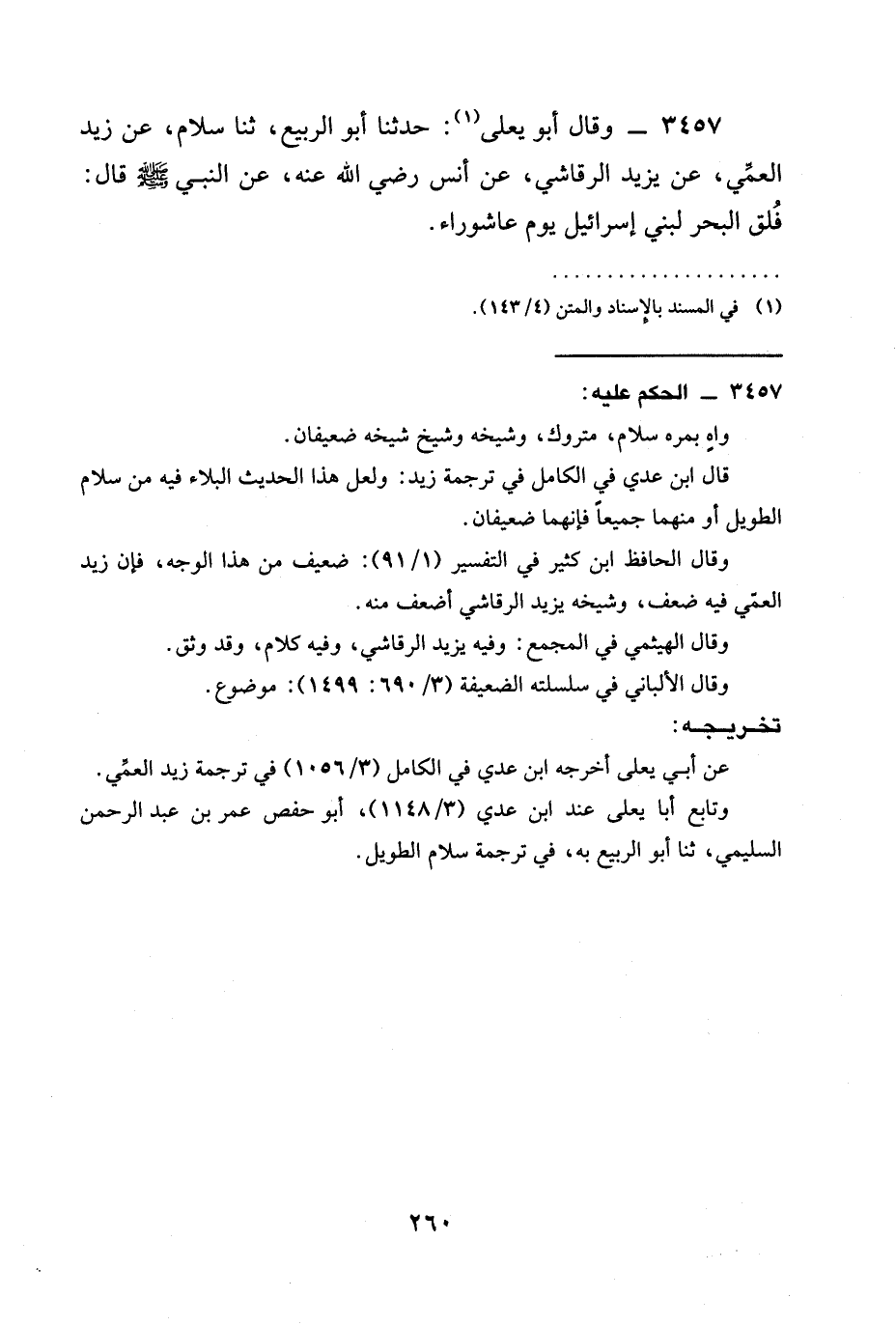 3457 - وَقَالَ أَبُو يَعْلَى: حدثنا أَبُو الرَّبِيعِ، ثنا سَلَّامٌ، عَنْ زَيْدٍ الْعَمِّيِّ، عَنْ يَزِيدَ الرَّقَاشِيِّ، عَنْ أَنَسٍ رَضِيَ الله عَنْه، عَنْ النَّبِيِّ صَلَّى اللَّهُ عَلَيْهِ وَسَلَّمَ قَالَ: §فُلِقَ الْبَحْرُ لِبَنِي إِسْرَائِيلَ يَوْمَ عَاشُورَاءَ.