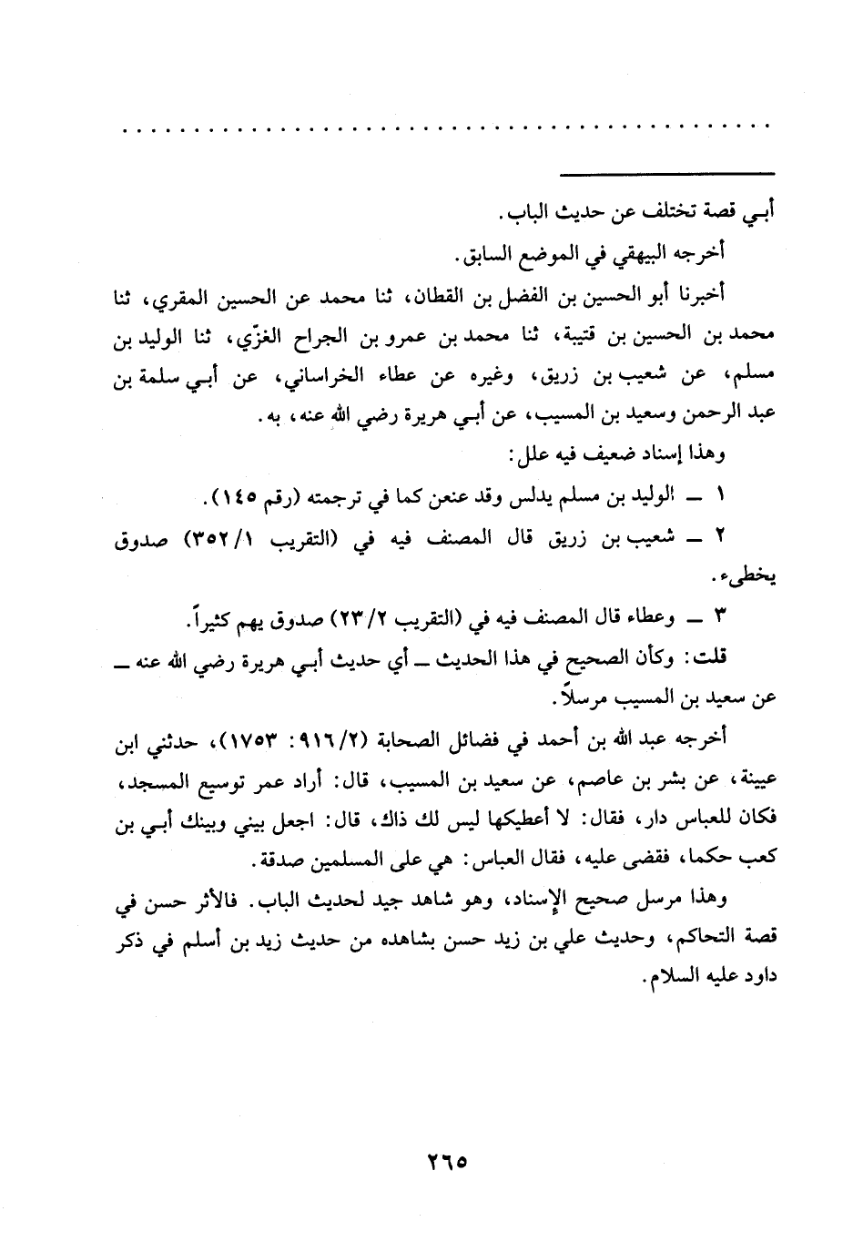 أخرجه عبد الله بن أحمد في فضائل الصحابة (2/ 916: 1753)، حدثني ابن عيينة، عن بشر بن عاصم، عن سعيد بن المسيب، قال: أراد عمر توسيع المسجد، فكان للعباس دار، فقال: لا أعطيكها ليس لك ذاك، قال: اجعل بيني وبينك أبي بن كعب حكما، فقضى عليه، فقال العباس: هي على المسلمين صدقة.