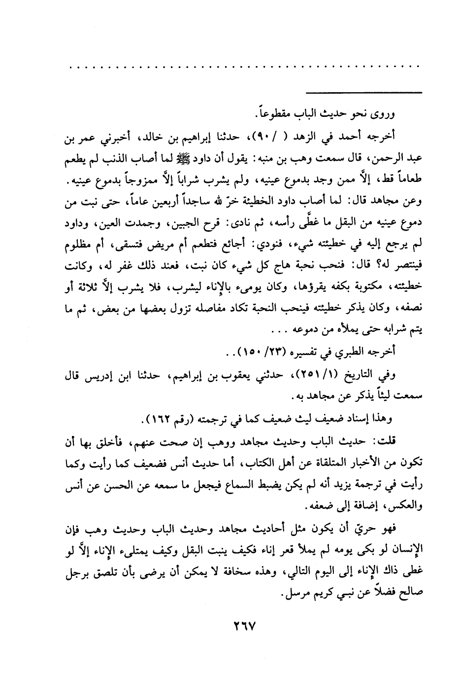 فهو حريّ أن يكون مثل أحاديث مجاهد وحديث الباب وحديث وهب فإن الإنسان لو بكى يومه لم يملأ قعر إناء فكيف ينبت البقل وكيف يمتلئ الإناء إلَّا لو غطى ذاك الإناء إلى اليوم التالي، وهذه سخافة لا يمكن أن يرضى بأن تلصق برجل صالح فضلًا عن نبي كريم مرسل. =