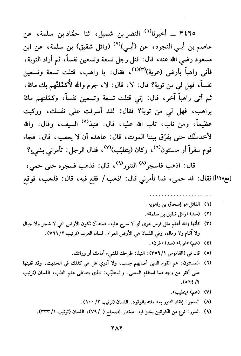 3465 - أخبرنا النَّضْرُ بْنُ شُمَيْلٍ، ثنا حَمَّادُ بْنُ سَلَمَةَ، عَنْ عَاصِمِ بْنِ أَبِي النَّجُودِ، عَنْ (أَبِي) (وَائِلٍ شَقِيقِ) بْنِ سَلَمَةَ، عَنِ ابْنِ مَسْعُودٍ رَضِيَ الله عَنْه، قَالَ: §قَتَلَ رَجُلٌ تِسْعَةً وَتِسْعِينَ نَفْسًا، ثُمَّ أَرَادَ التَّوْبَةَ، فَأَتَى رَاهِبًا بِأَرْضٍ (عَرِيَّةٍ) ، فَقَالَ: يَا رَاهِبُ، قَتَلْتُ تِسْعَةً وَتِسْعِينَ نَفْسًا، فَهَلْ لِي مِنْ تَوْبَةٍ؟ قَالَ: لَا، قَالَ: لا، جرم وَاللَّهِ لَأُكَمِّلَنَّهُمْ بِكَ مِائَةً، ثُمَّ أَتَى رَاهِبًا آخَرَ، قَالَ: إِنِّي قَتَلْتُ تِسْعَةً وَتِسْعِينَ نَفْسًا، وَكَمَّلْتُهُمْ مِائَةً بِرَاهِبٍ، فَهَلْ لِي مِنْ تَوْبَةٍ؟ فَقَالَ: لَقَدْ أَسْرَفْتَ عَلَى نَفْسِكَ، وَرَكِبْتَ عَظِيمًا، وَمَنْ تَابَ، تَابَ اللَّهُ عَلَيْهِ، قَالَ: فَنَبَذَ السَّيْفَ، وَقَالَ: وَاللَّهِ لَأَخْدُمَنَّكَ حَتَّى يُفَرِّقَ بَيْنَنَا الْمَوْتُ، قَالَ: عاهده أَنْ لَا يَعْصِيَهُ، قَالَ: فجاء قوم سفرا أَوْ مُسْنِتُونَ، وَكَانَ (يَتَطَبَّبُ) ، فَقَالَ الرَّجُلُ: تَأْمُرْنِي بِشَيْءٍ؟