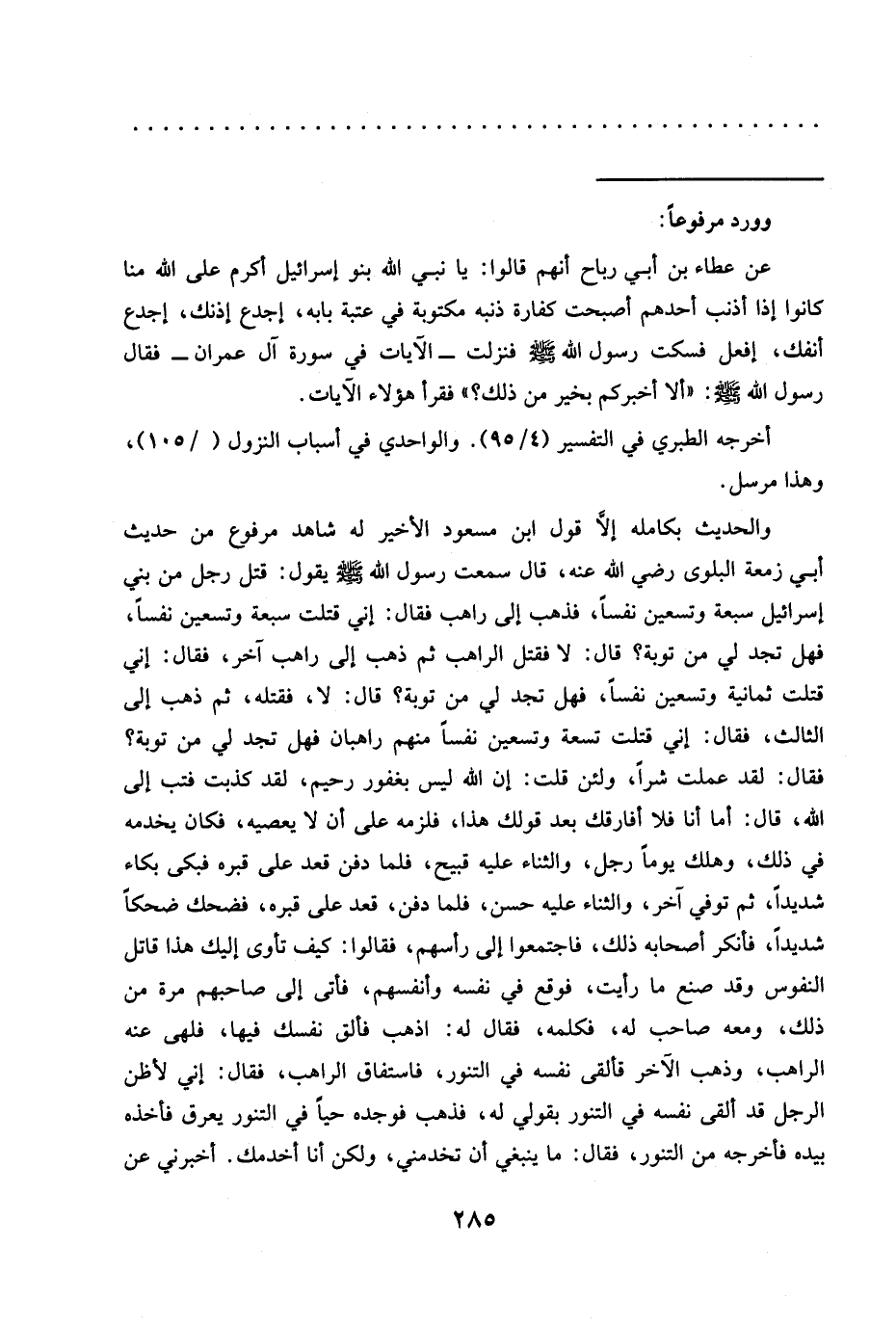 عن عطاء بن أبي رباح أنهم قالوا: يا نبي الله بنو إسرائيل أكرم على الله منا كانوا إذا أذنب أحدهم أصبحت كفارة ذنبه مكتوبة في عتبة بابه، إجدع إذنك، إجدع أنفك، إفعل فَسَكَتَ رَسُولُ اللَّهِ -صَلَّى اللَّهُ عَلَيْهِ وَسَلَّمَ- فنزلت -الآيات في سورة آل عمران- فَقَالَ رَسُولُ اللَّهِ -صَلَّى اللَّهُ عَلَيْهِ وَسَلَّمَ-: "ألا أخبركم بخير من ذلك؟ " فقرأ هؤلاء الآيات.