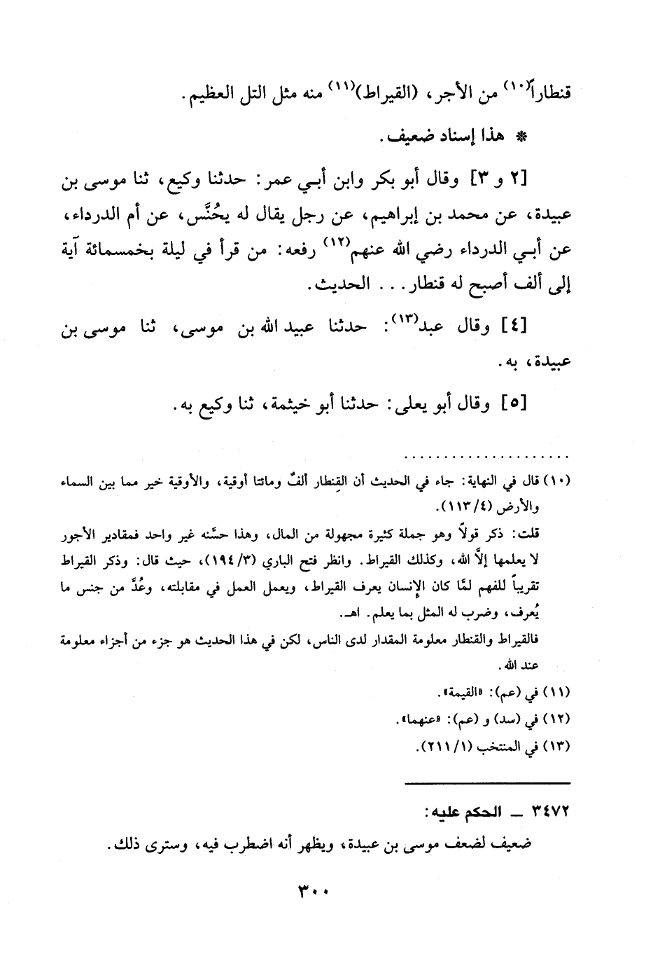 [2 و 3] وقال أبو بكر وابن أَبِي عُمَرَ: حَدَّثَنَا وَكِيعٌ، ثنا مُوسَى بْنُ عُبَيْدَةَ، عَنْ مُحَمَّدِ بن إبراهيم، عَنْ رَجُلٍ يُقَالُ لَهُ يحُنَّس، عَنْ أُمُّ الدَّرْدَاءِ، عَنْ أَبِي الدَّرْدَاءِ رَضِيَ اللَّهُ عنهم (¬12) رفعه: مَنْ قَرَأَ فِي لَيْلَةٍ بِخَمْسِمِائَةِ آيَةٍ إِلَى ألف أصبح له قنطار ... الحديث.