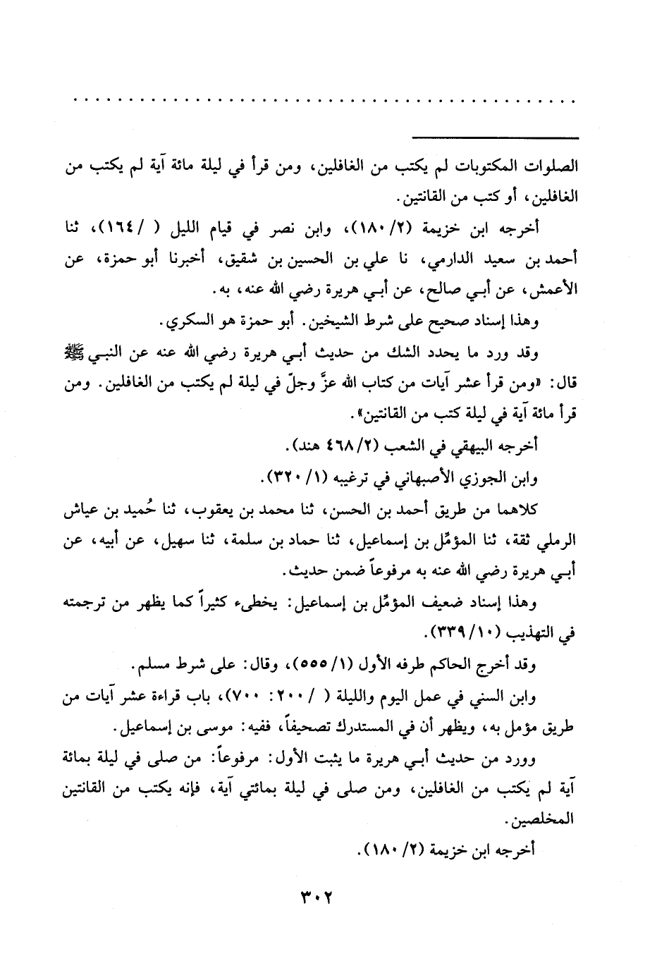 = الصلوات المكتوبات لم يكتب من الغافلين، ومن قرأ في ليلة مائة آية لم يكتب من الغافلين، أو كتب من القانتين.