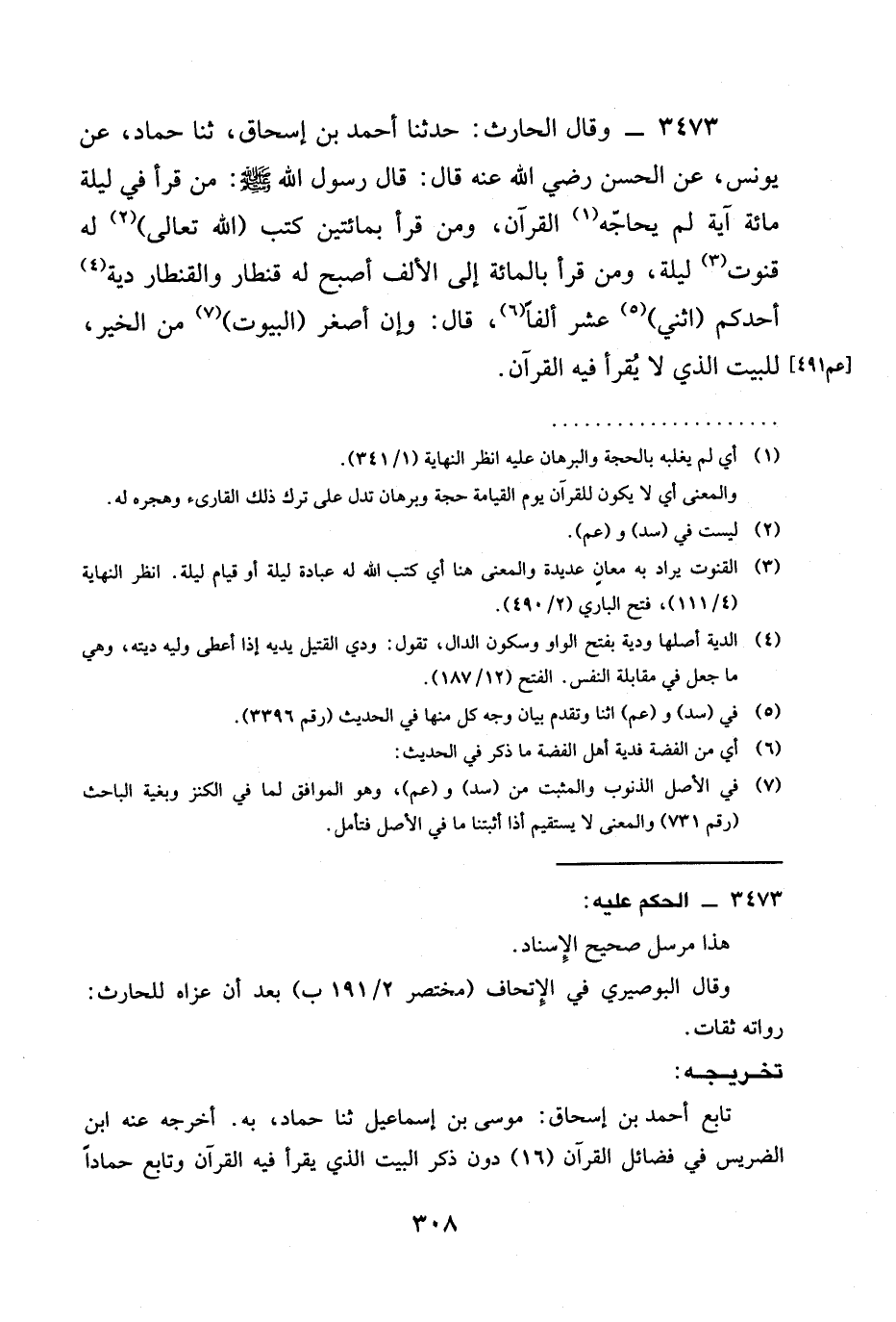 3473 - وقال الْحَارِثُ: حدثنا أَحْمَدُ بْنُ إِسْحَاقَ، ثنا حَمَّادٌ، عَنْ يُونُسَ، عَنِ الْحَسَنِ رَضِيَ الله عَنْه قَالَ: قَالَ رَسُولُ اللَّهِ صَلَّى اللَّهُ عَلَيْهِ وَسَلَّمَ: §مَنْ قَرَأَ فِي لَيْلَةٍ مِائَةَ آيَةٍ لَمْ يُحَاجَّهُ الْقُرْآنُ، وَمَنْ قَرَأَ بمائتين كتب (الله تعالى) لَهُ قُنُوتُ لَيْلَةٍ، وَمَنْ قَرَأَ بِالْمِائَةِ إِلَى الْأَلْفِ أَصْبَحَ له قِنْطَارٌ وَالْقِنْطَارُ دية أحدكم (اثني) عَشَرَ أَلْفًا، قال: وإن أصغر (الْبُيُوتِ) مِنَ الْخَيْرِ، للبيت الَّذِي لَا يُقْرَأُ فِيهِ الْقُرْآنُ.
